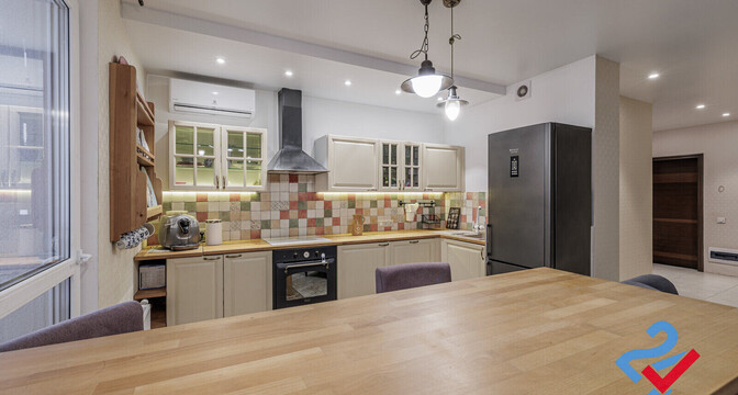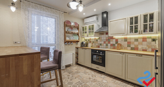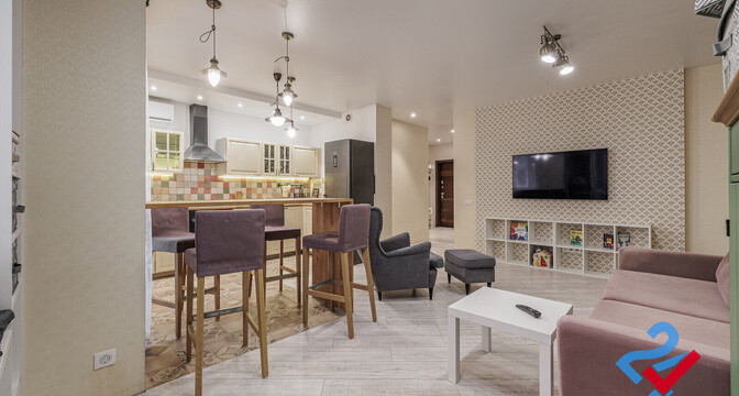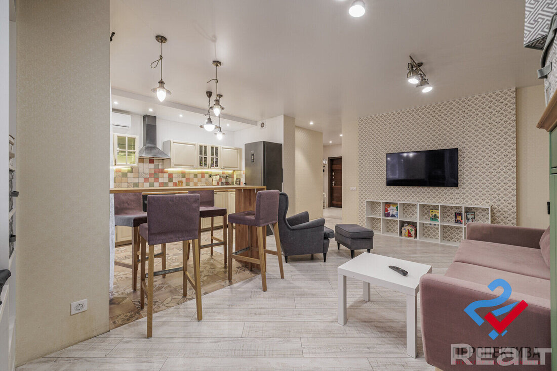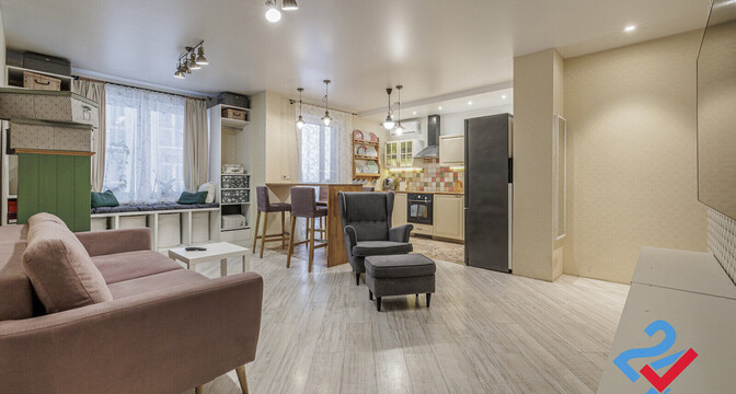 Гостиная совмещена с кухней. В зоне гостиной стоит диван, кресло, журнальный столик, есть места для хранения. В кухне из техники — варочная панель Electrolux с вытяжкой, посудомоечная машина, духовой шкаф, холодильник. Установлен кондиционер Electrolux. В кухне есть выход на застекленную лоджию.
