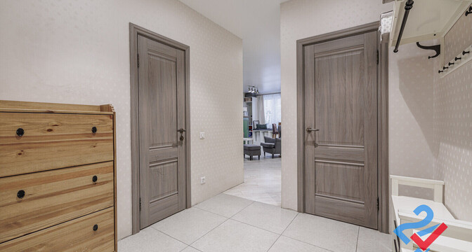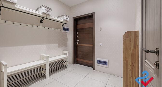Квартира находится на 11 этаже. Общая площадь — 65 квадратов, жилая — 52. У входа стоит банкетка, есть комод и оборудована открытая гардеробная, где можно повесить верхнюю одежду, оставить обувь.