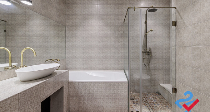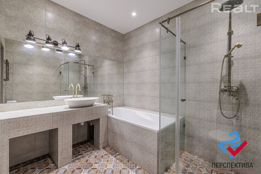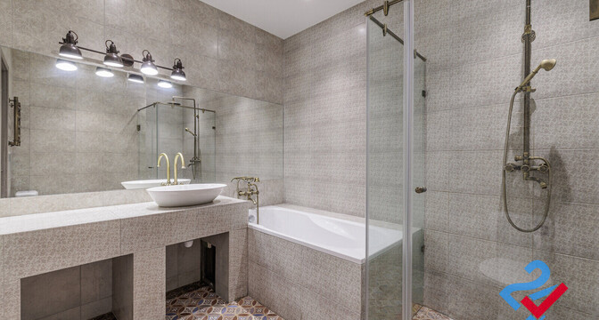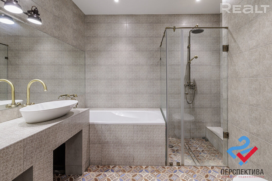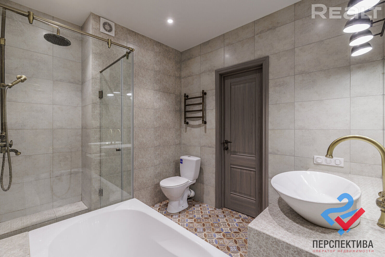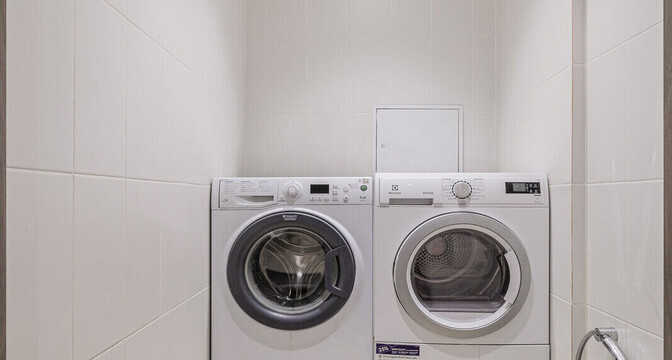 Санузел совмещенный. Установлена и душевая кабина, и ванна. Стиральная и сушильная машина вынесены в отдельную комнату — постирочную.