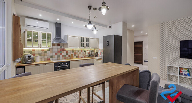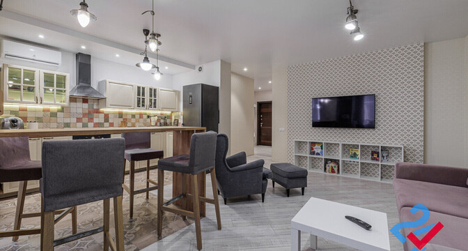 В жилых комнатах на полу лежит ламинат 33 класса. Потолки натяжные, со встроенной системой освещения.