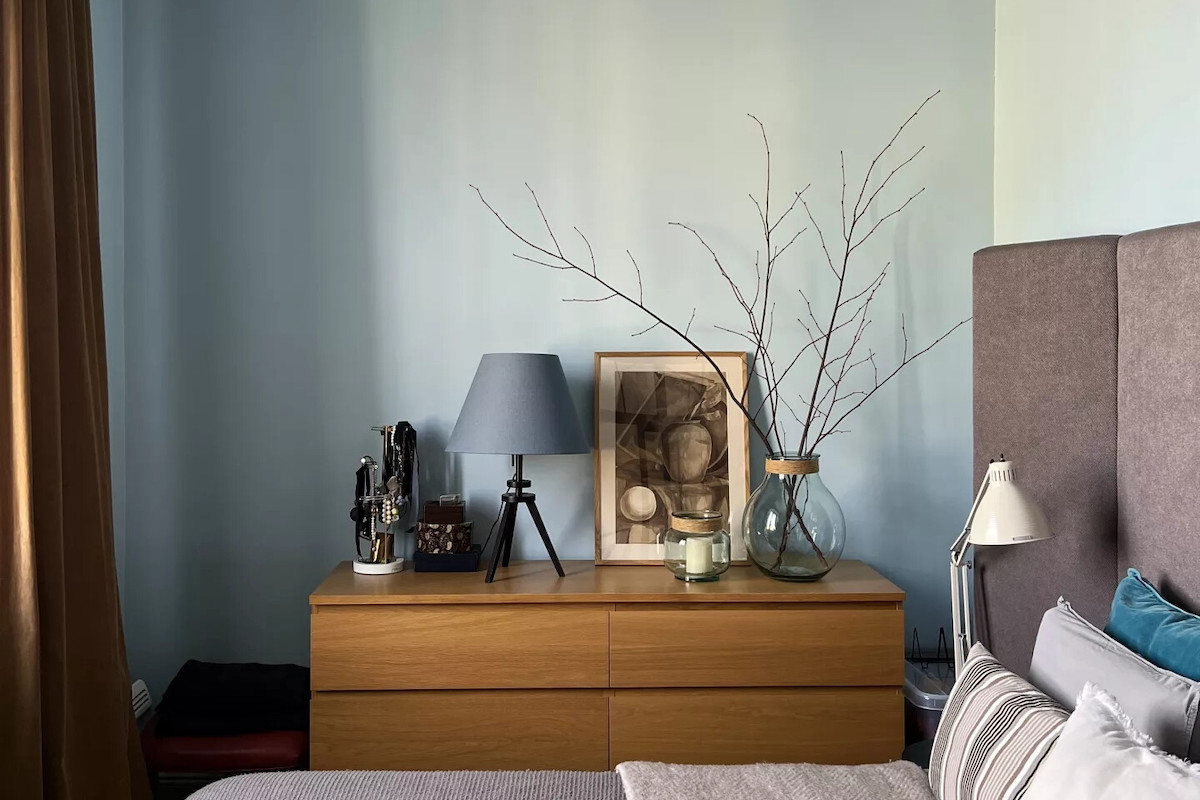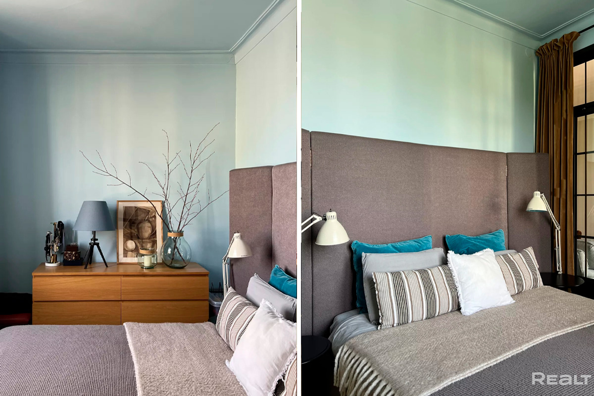 Спальня от гостиной отделена раздвижными дверьми. В спальне стены выкрашены в нежно-голубой цвет. Двуспальная кровать — с высоким изголовьем.