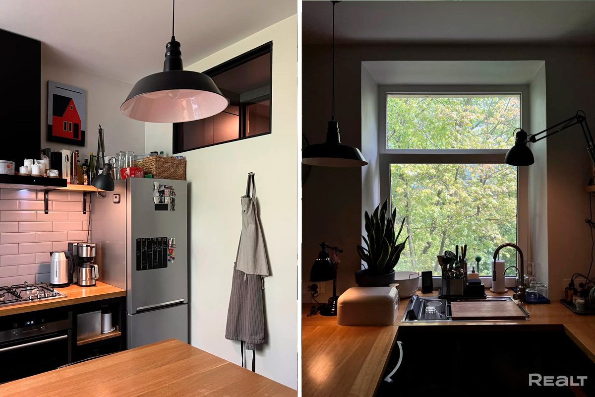 В кухне над рабочей зоной — окно, из которого виден зеленый двор. В качестве стола — широкая барная стойка, которая выступает продолжением столешницы.