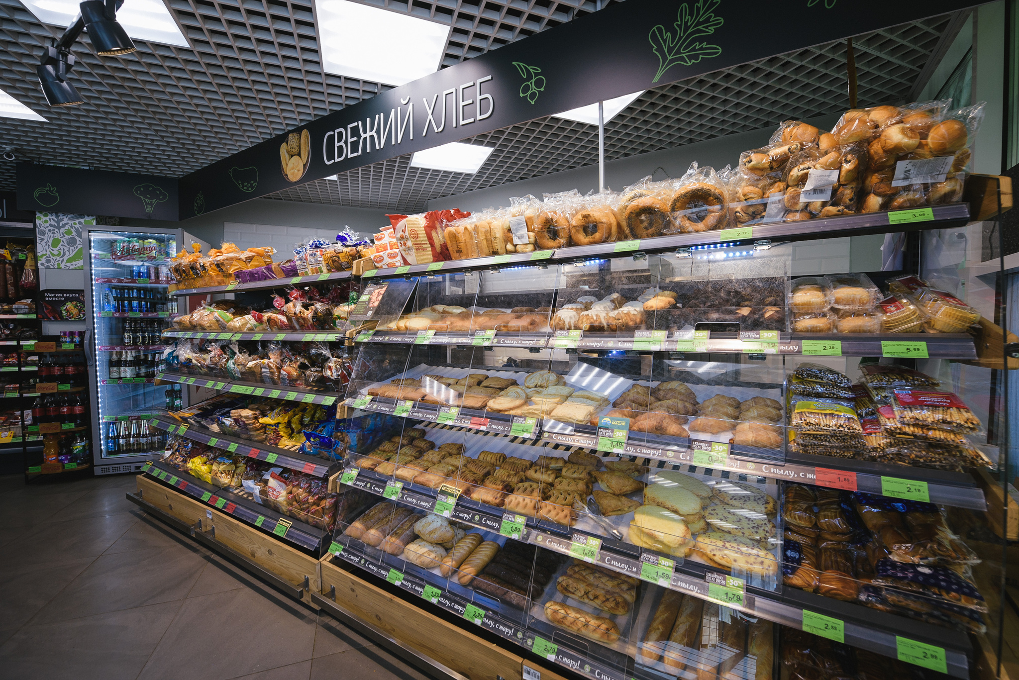 В магазине поставили две длинные витрины — молочную и мясную. За ними разместился прилавок со свежим хлебом. Дальше обустроена зона фруктов и овощей. Много места занимает бакалея, замороженные продукты, напитки, хозтовары и корм для питомцев. Кстати, тут предусмотрен и кофе-пойнт с порцией капучино за 1,99 рубля.
