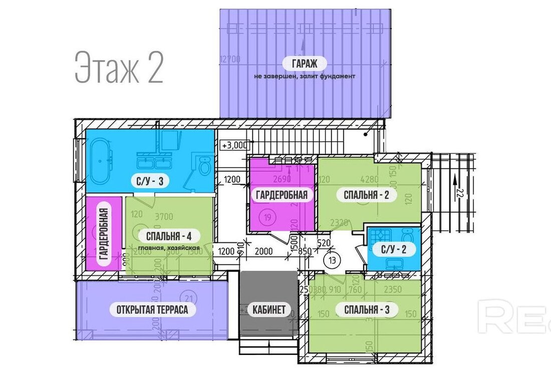 Общая площадь дома 190 квадратов, год постройки — 2020 год. По проекту к строению должен примыкать гараж, но по факту имеется только его фундамент. Впрочем, жилая часть уже практически готова.
