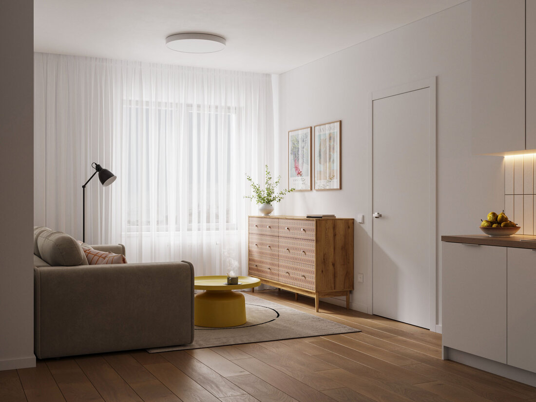 В отделке преобладают материалы с нейтральной палитрой. На полу будет ламинат с фаской и имитацией шпона натурального дерева. Стены будут окрашены в цвета на выбор — с поэтичными названиями «Туманный Копенгаген» и «Рассвет над городом». Они станут своеобразным холстом для реализации идей будущих жителей. Их дополнят стильные и лаконичные двери и плинтуса белого цвета. Чтобы сделать интерьер уникальнее, останется только добавить акцентов при помощи мебели и декора.