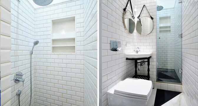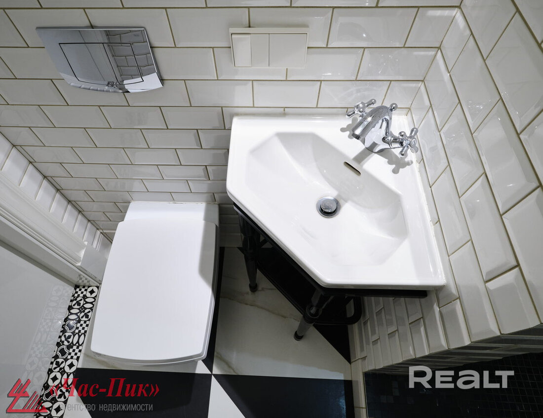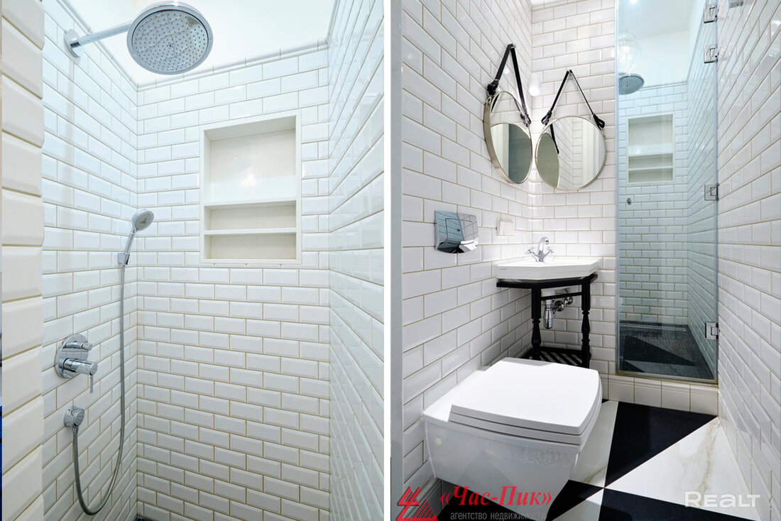 В квартире два санузла, в одном установлена ванна, а во втором — душевая. Есть стиральная и сушильная машины. Установлена система смягчения воды. Есть отдельная кладовая-гардеробная, где оборудованы системы хранения.