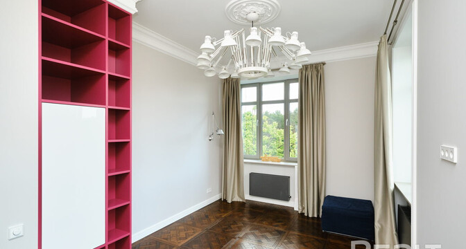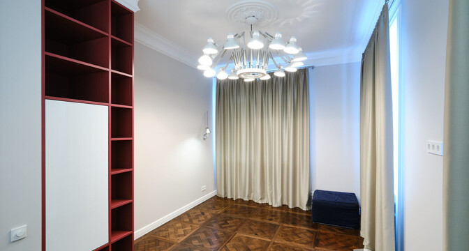 Установлены премиальные стеклопакеты Rehau 70 мм с фурнитурой Schüco, дизайн которых согласован — это важный момент для домов, которые признаны историко-культурной ценностью. Подоконники выполнены из кварцевого камня, на окнах — портьеры, которые полностью блокируют свет. Окон, кстати, в некоторых комнатах по несколько. А на потолке выполнены декоративные розетки для украшения люстр.