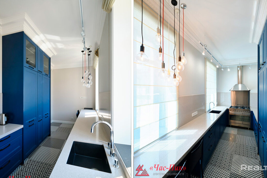 В квартиру попадает много света. В кухне вдоль рабочей зоны — окно. Кухонная мебель выполнена в акцентном синем цвете, столешница — из камня. встроенный Холодильник — Liebherr, посудомоечная машина — Bosch, газовый варочный центр с электрическим духовым шкафом и вытяжка — Smeg.