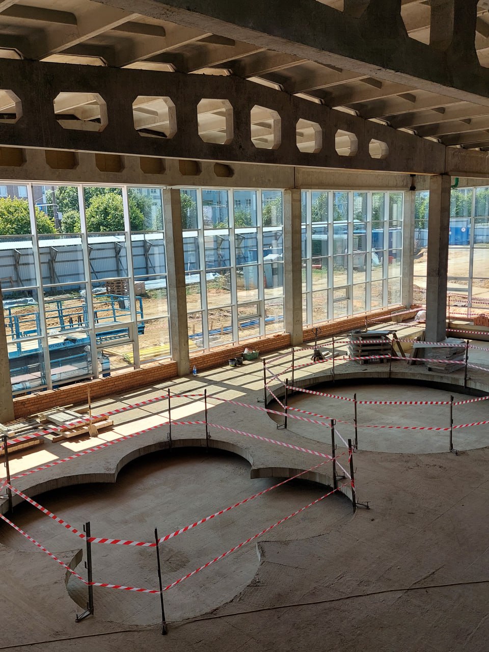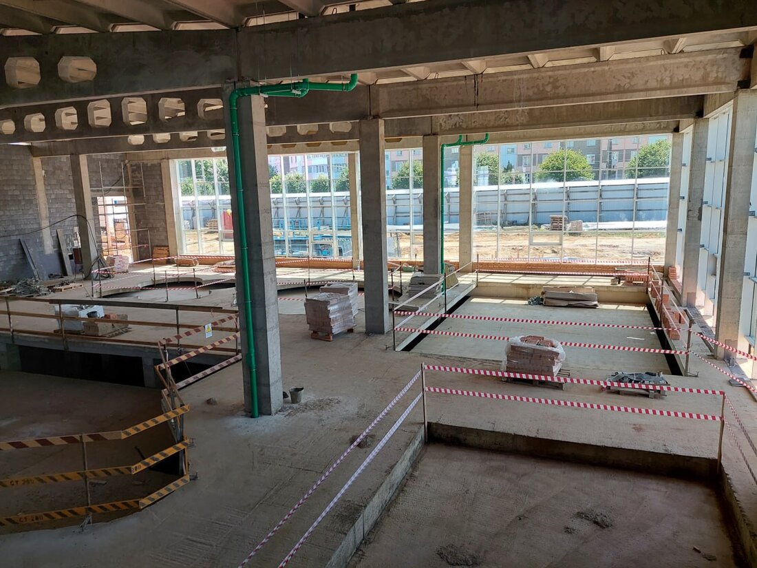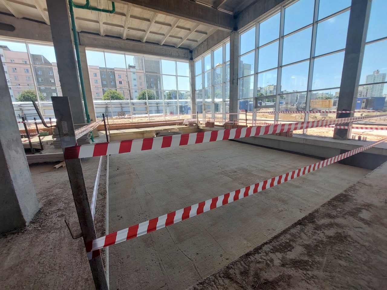 Блок, где разместятся бассейны, уже остеклен, общестроительные работы здесь закончены, следующий этап — оштукатуривание стен и устройство стяжек пола. По входной группе еще предстоит залить бетонные полы и завершить монолит на лестнично-лифтовом блоке. До конца месяца строители СУ-200 треста № 35 планируют закончить работы по кровле.