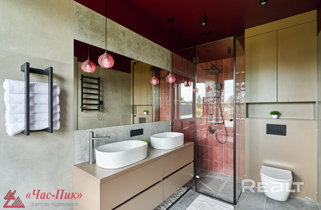 Санузел с сауной, мастер-спальня с ванной. В пригороде Минска продается дом с крутым интерьером