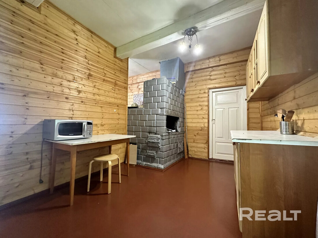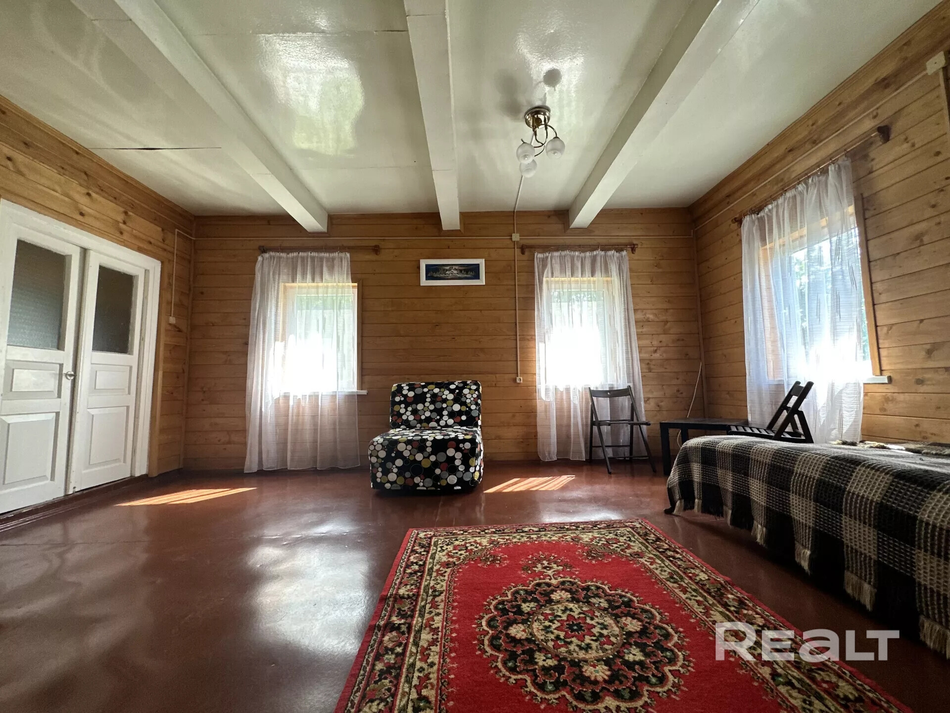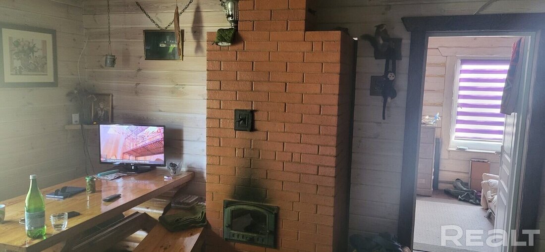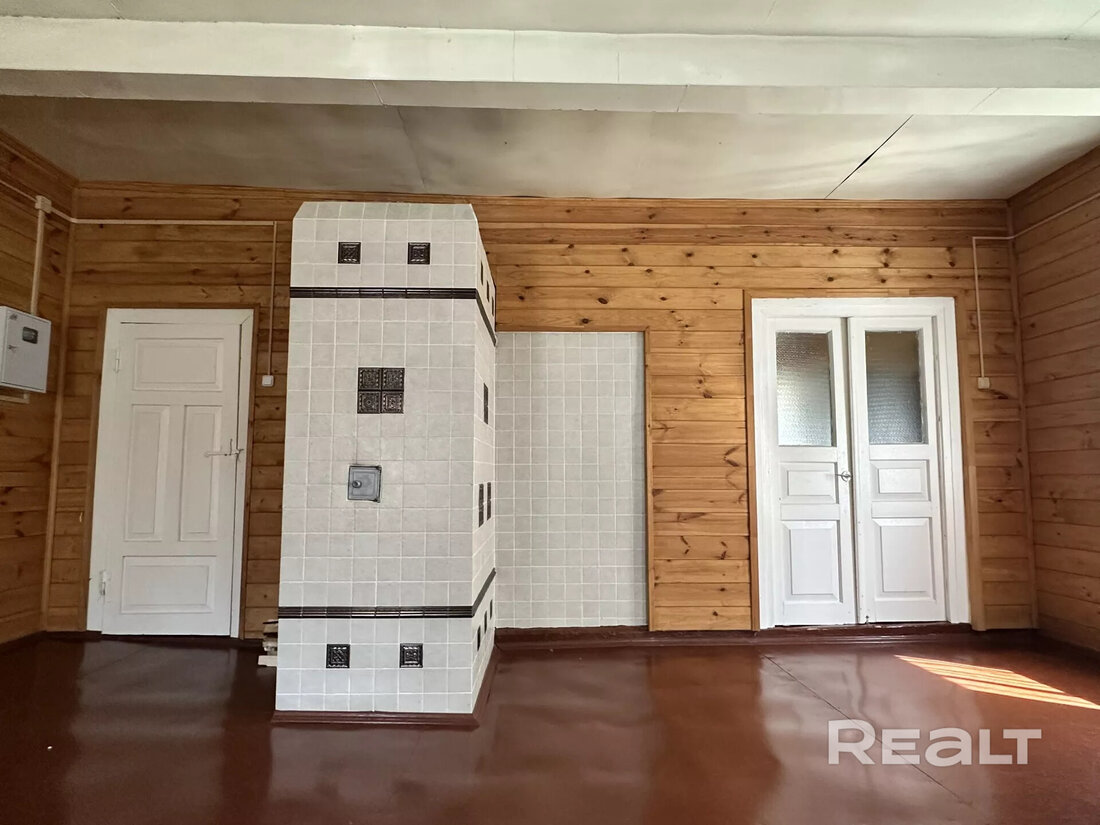 С главного входа попадаешь в просторную веранду, из нее — в помещение бани, в которой осталось оборудовать деревянный полок. В доме есть кладовая, которую можно переоборудовать в жилую комнату или санузел. Далее жилая проходная комната с выходом на вторую веранду. Рядом кухня с печкой, за ней — большая гостиная (при желании можно разделить на несколько комнат).