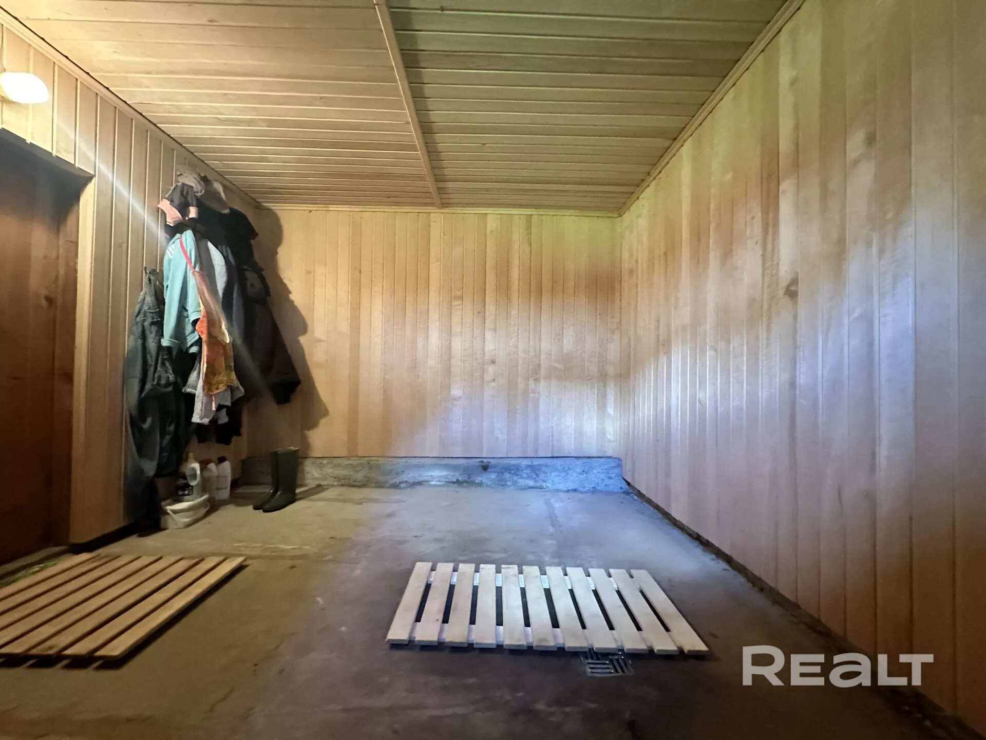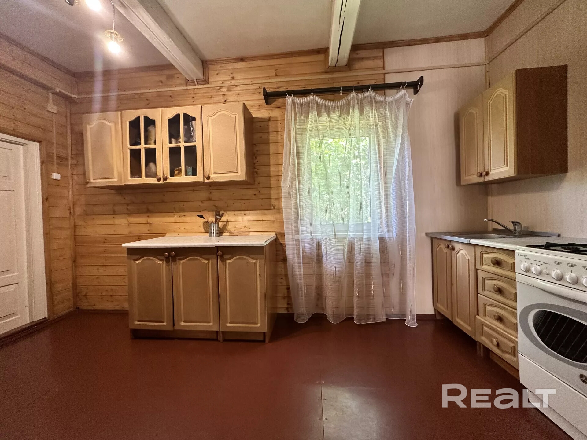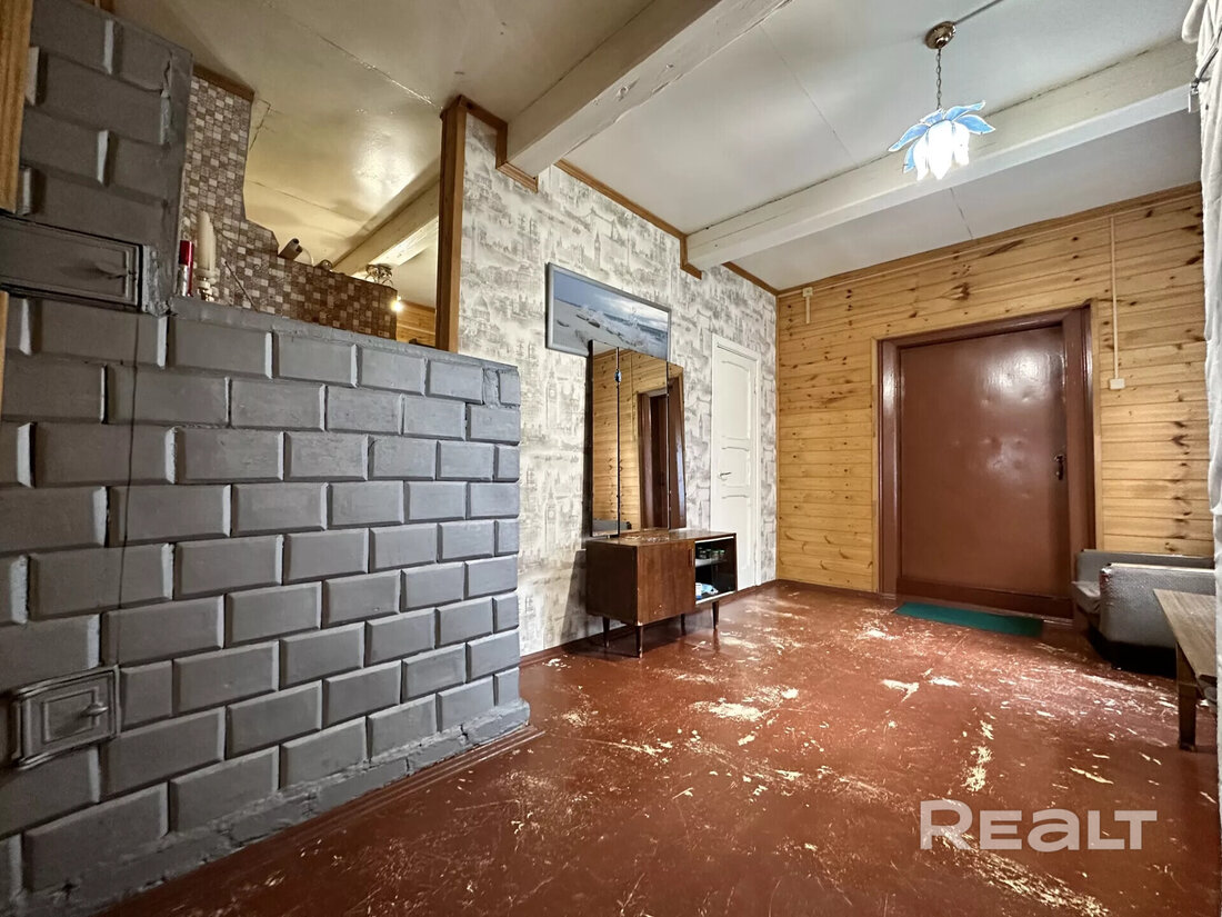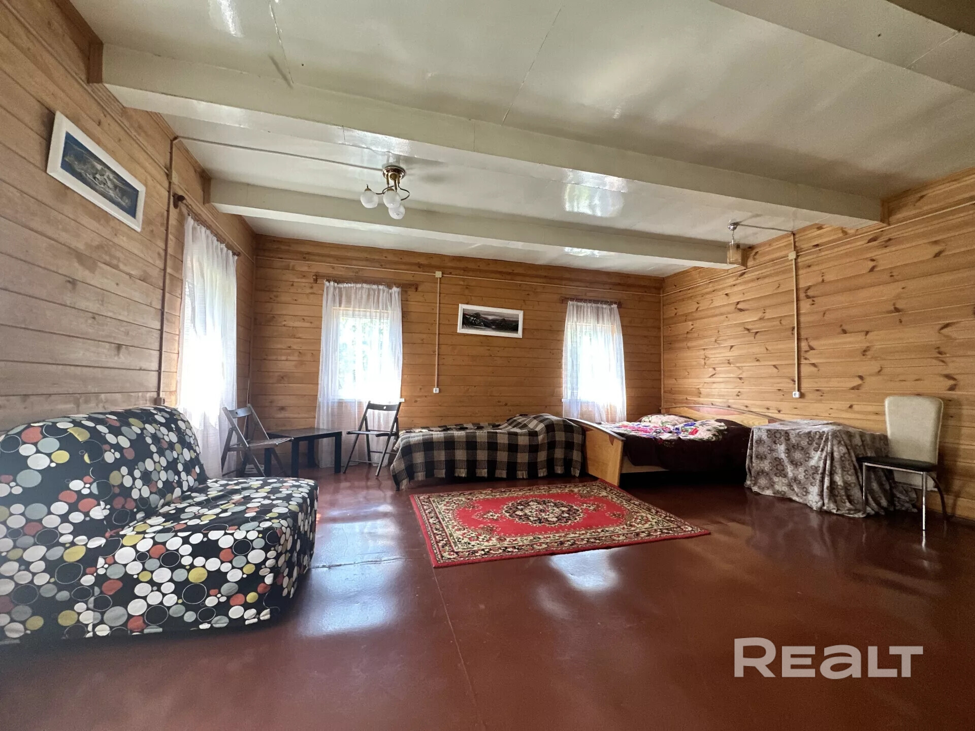 С главного входа попадаешь в просторную веранду, из нее — в помещение бани, в которой осталось оборудовать деревянный полок. В доме есть кладовая, которую можно переоборудовать в жилую комнату или санузел. Далее жилая проходная комната с выходом на вторую веранду. Рядом кухня с печкой, за ней — большая гостиная (при желании можно разделить на несколько комнат).