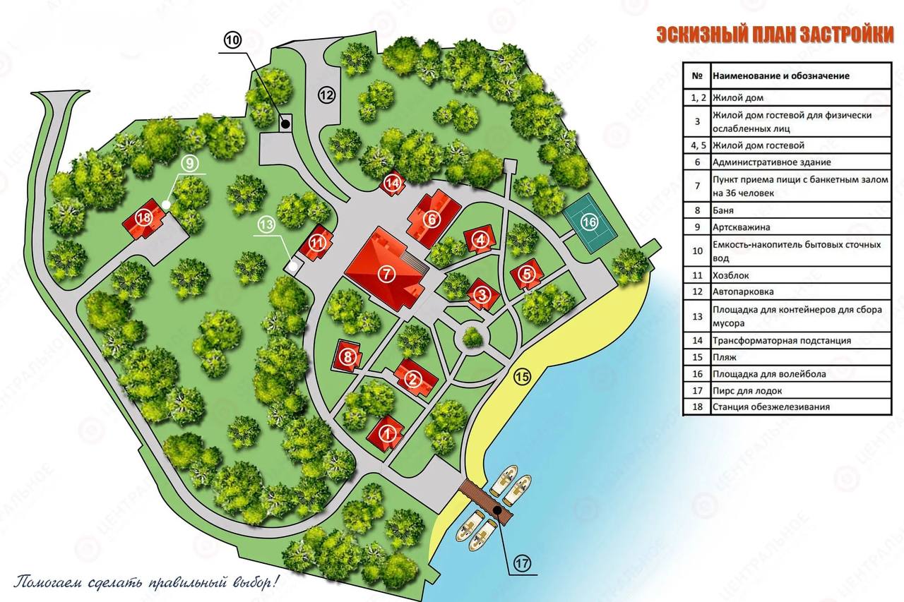 Территория базы отдыха — 2,87 га. Здесь уже провели земельные работы, выровняли рельеф, вырубили не нужные насаждения. Проездные дороги покрыли щебнем, пешеходные дорожки благоустроили. Спланированы участки для пирса и пляжной зоны. Кстати, береговая линия арендована, то есть, прибрежная зона будет открытой только для гостей комплекса. Электричество заведено на участок, участок нормализован. Все строения законсервированы и документы готовы к сделке.