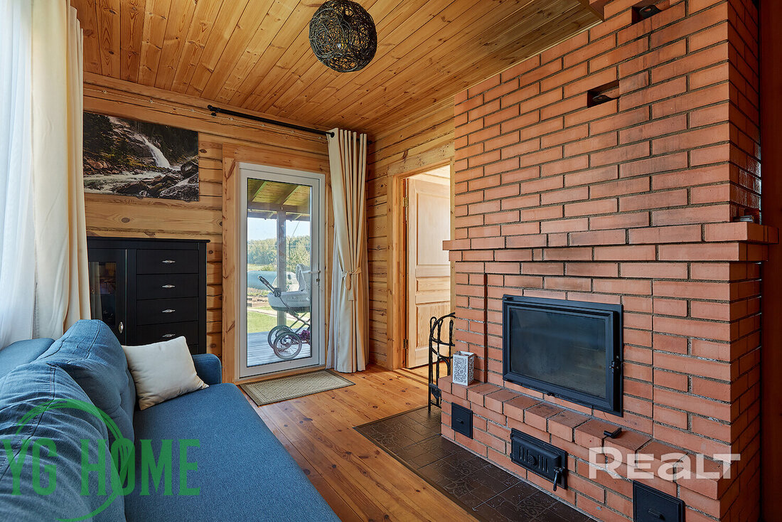 Дом находится в деревне Госьбищи в Узденском районе. Его построили из сруба в 2022 году на ленточном фундаменте. Под террасой и кухней — свайный фундамент. Первый этаж проконопачен, то есть утеплен путем запечатывания щелей. Стыки между бревнами на втором этаже заделали декоративным шнурком. Площадь дома — 82,3 м².