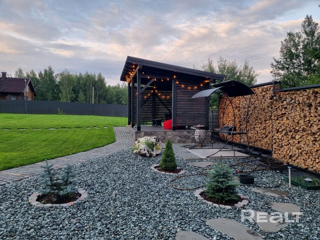 Отметим оформление зоны барбекю между беседкой и хозблоком. Здесь находится дровница, которая одновременно является фоновой стенкой. Решение практичное и одновременно дизайнерское, оригинальное.