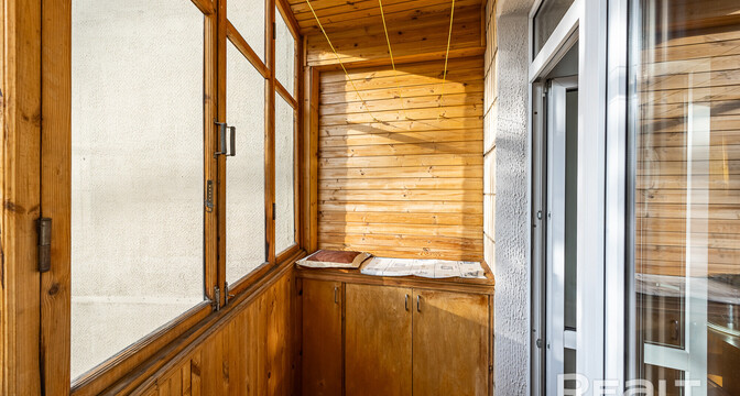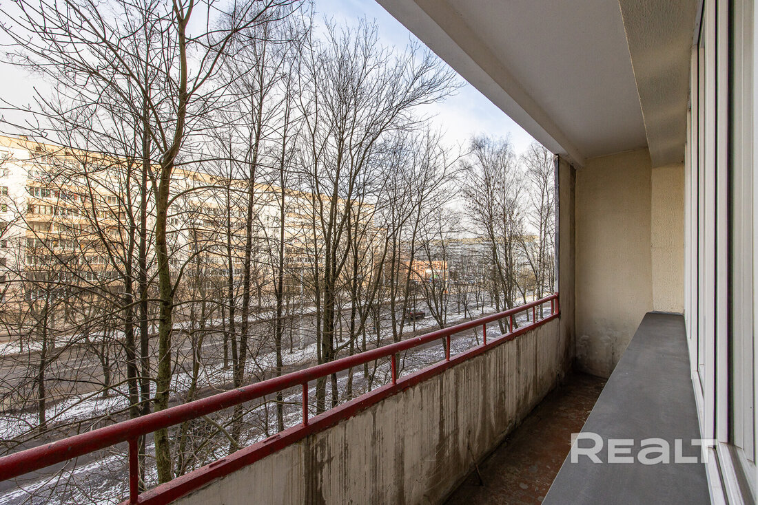 Кроме этого, в квартире три балкона. Застекленный — в кухне и два незастекленных в жилых комнатах. Посмотрите, насколько длинный один из этих балконов и сколько света попадает в комнату в большие окна.
