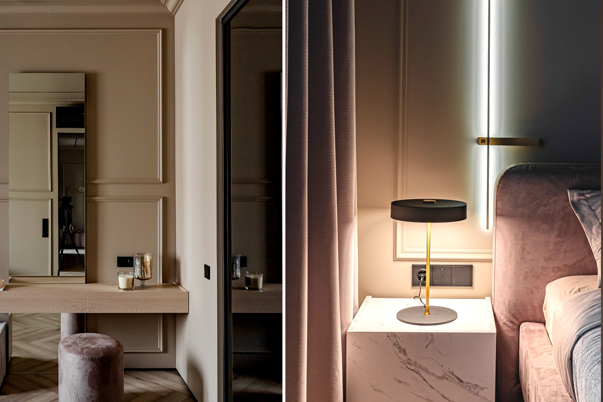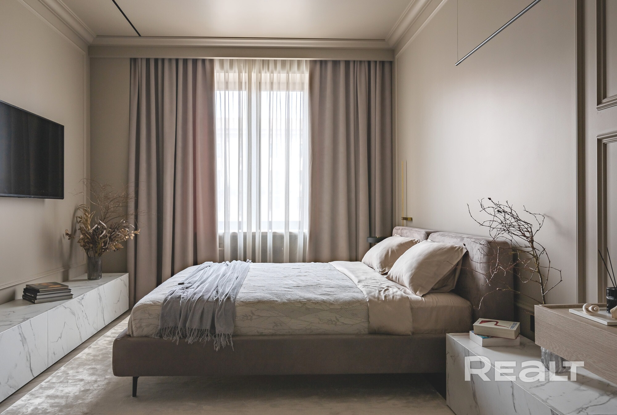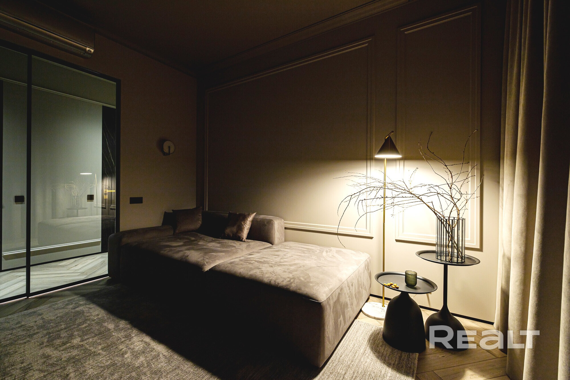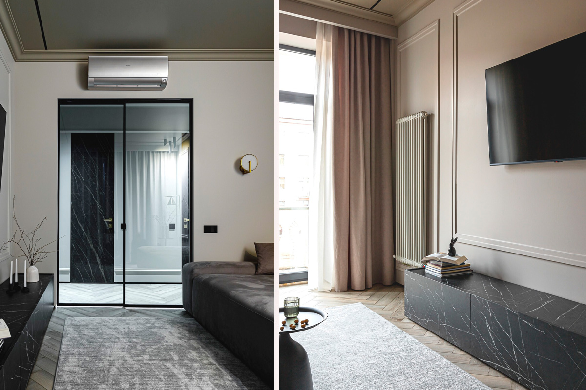 В одной жилой комнате оборудована гостиная, во второй — спальня. На полу кварц-виниловое покрытие, на стенах краска и молдинги. Межкомнатные двери выполнены из стекла. В ремонте использовали итальянские материалы.