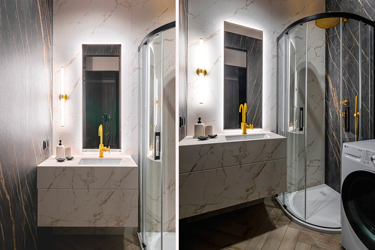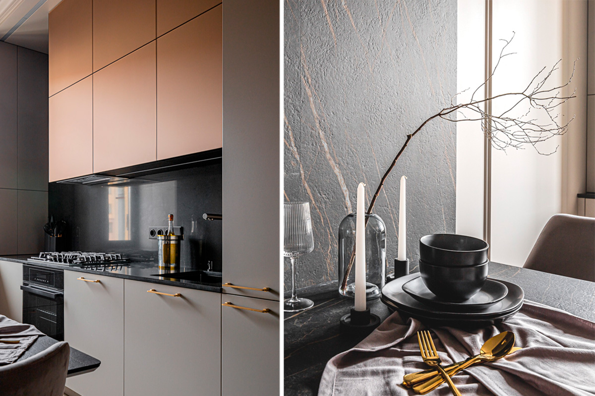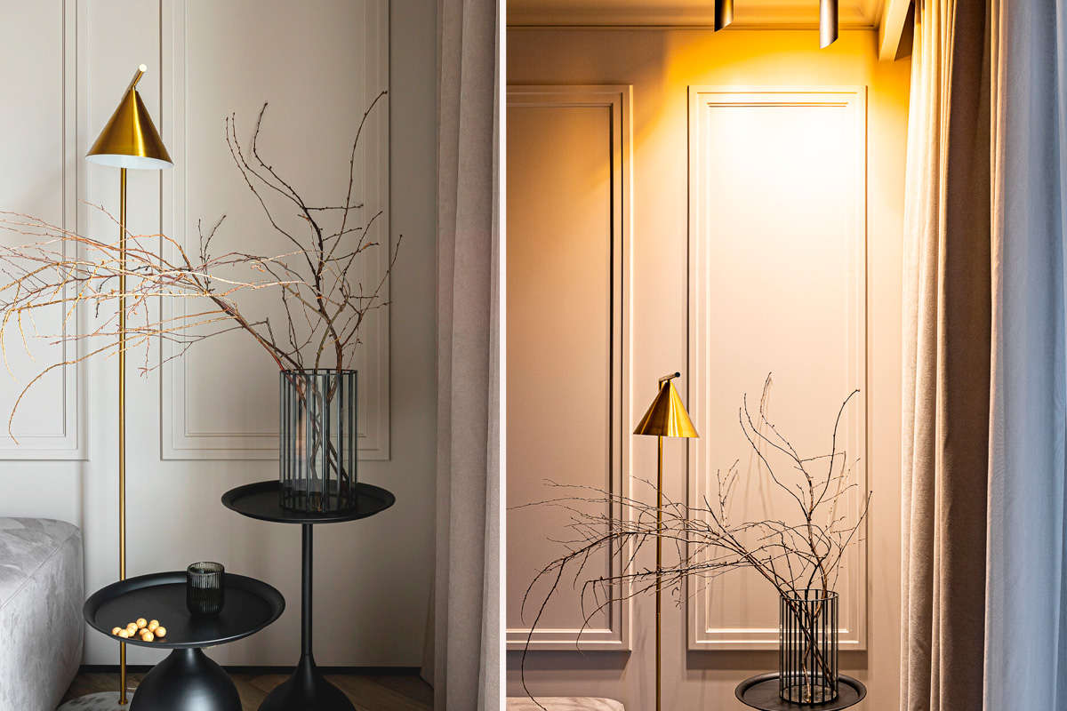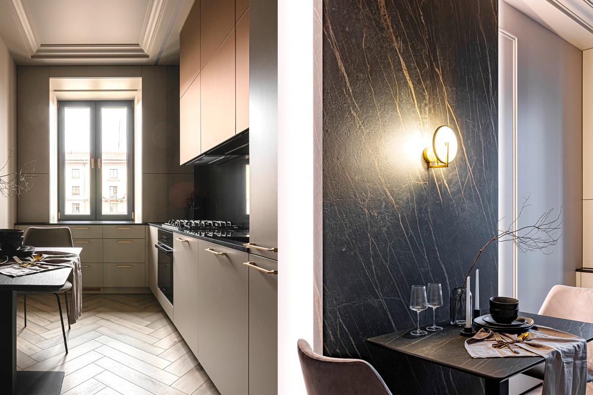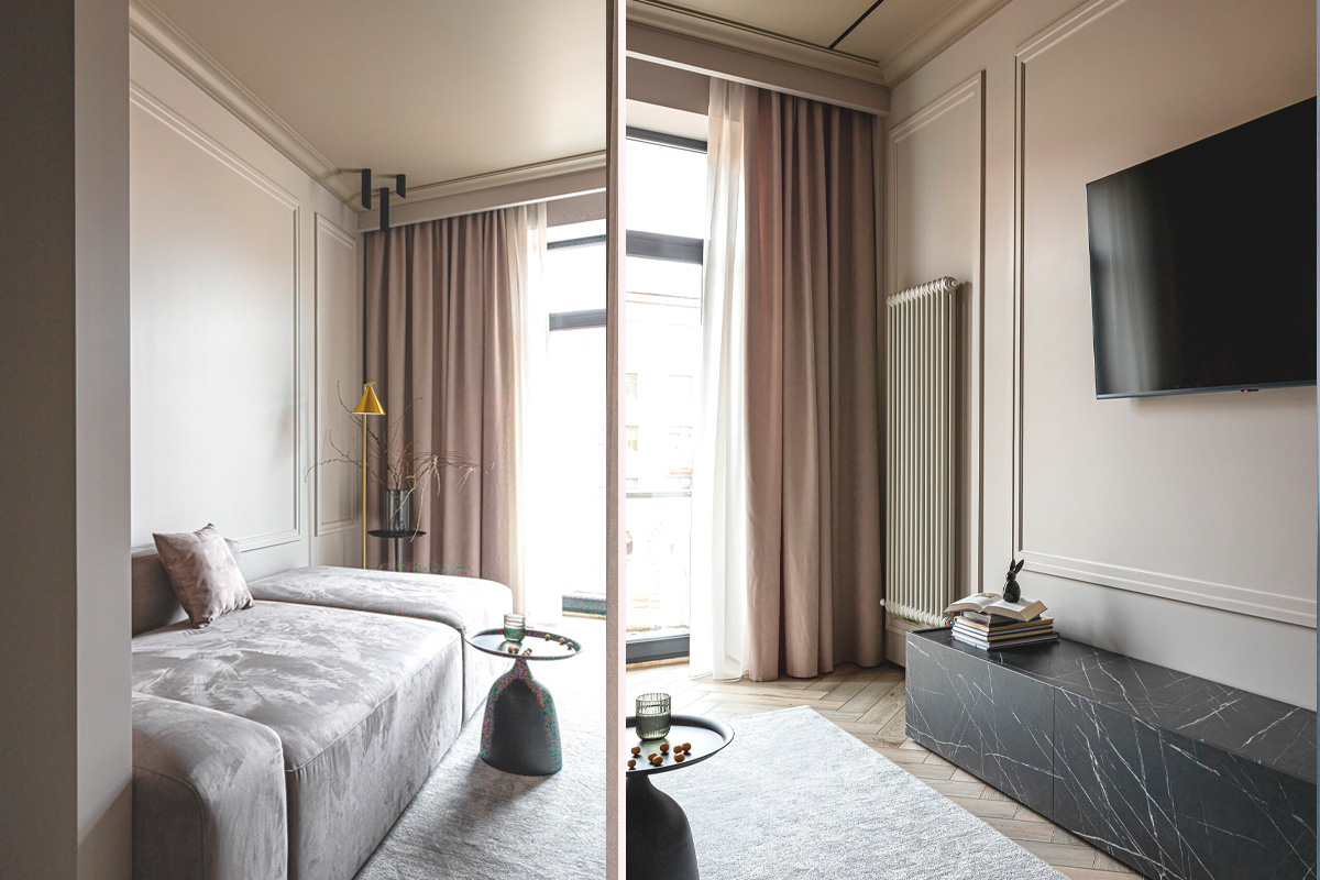 В одной жилой комнате оборудована гостиная, во второй — спальня. На полу кварц-виниловое покрытие, на стенах краска и молдинги. Межкомнатные двери выполнены из стекла. В ремонте использовали итальянские материалы.