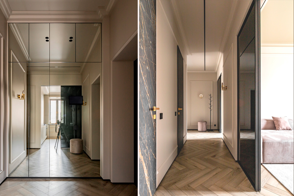 У входа установлен зеркальный шкаф. Вот как выглядит прихожая.