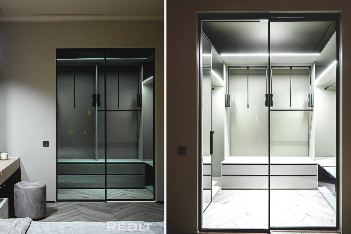 В спальне есть гардеробная с оборудованными местами для хранения.