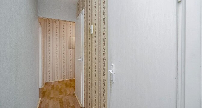 Квартира аккуратная. На полу лежит доска, покрытая лаком. В оконных проемах стоят деревянные стеклопакеты. Остаются в квартире два шкафа-купе и кухня.