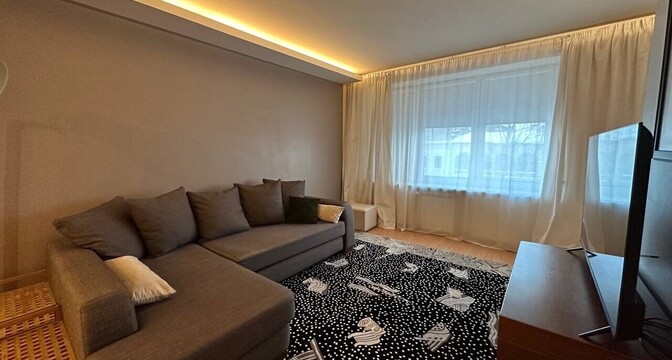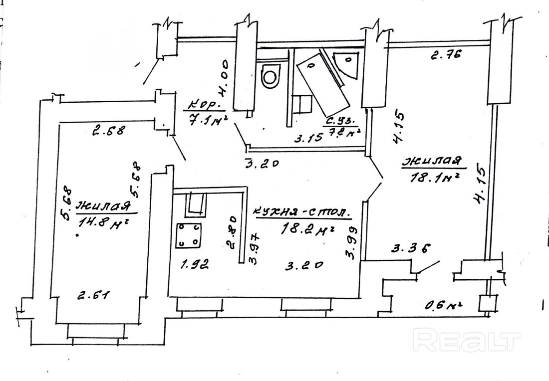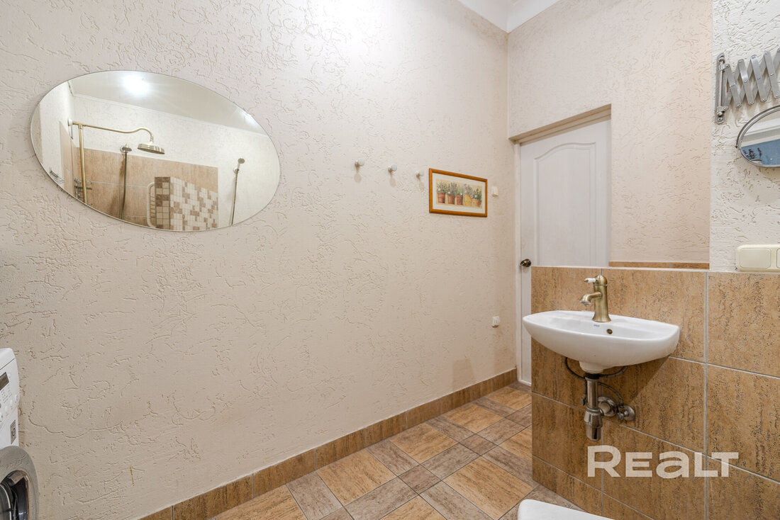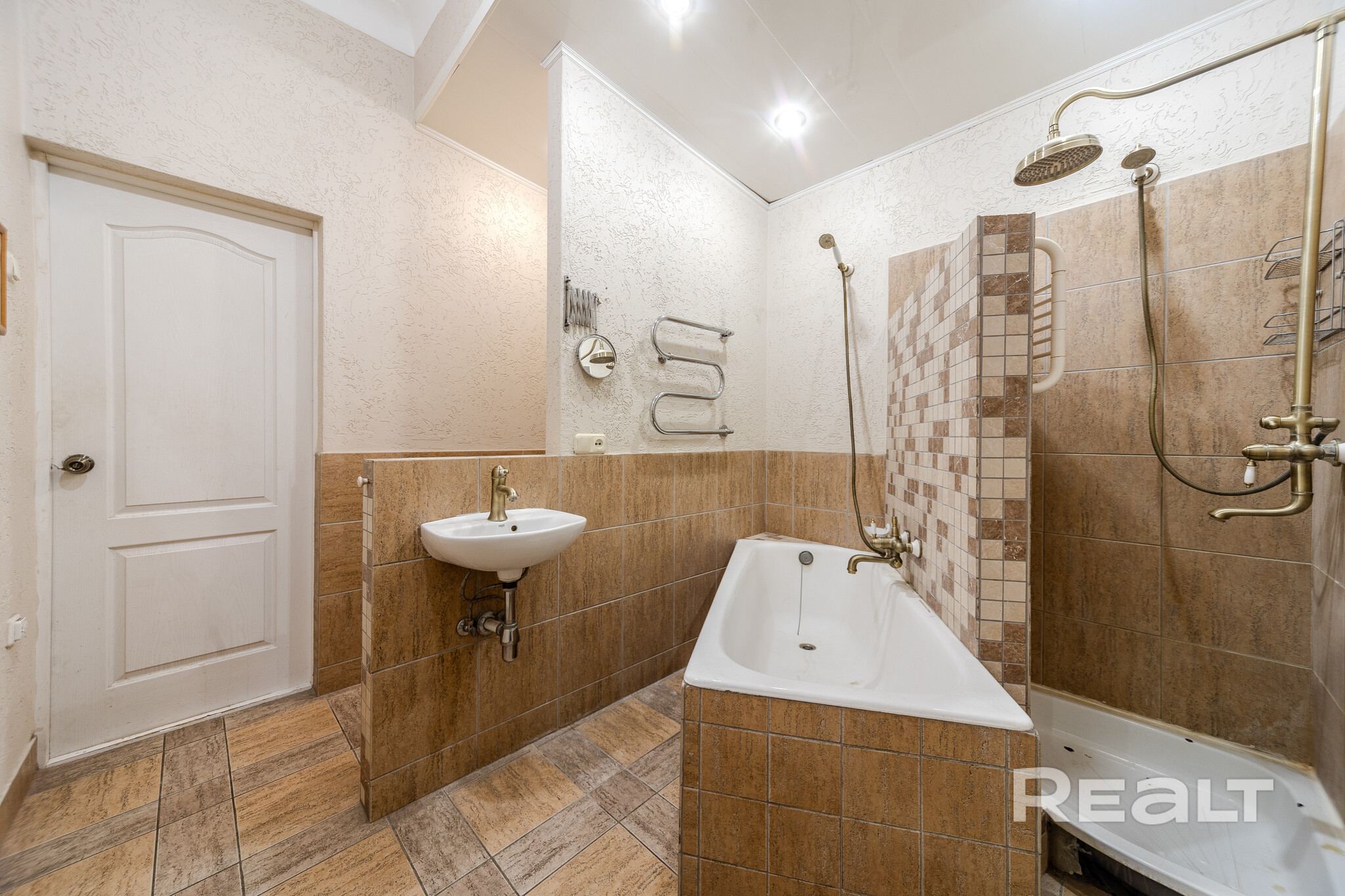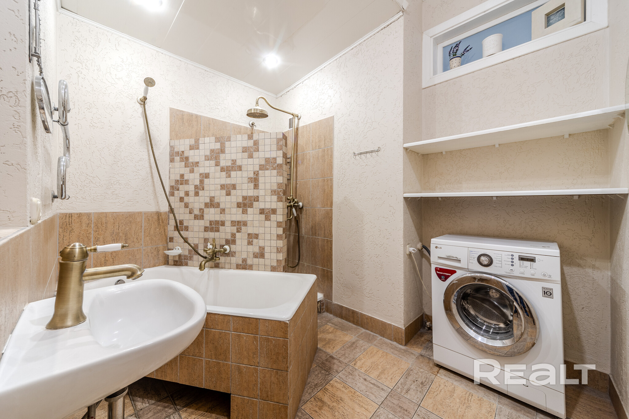 В квартире трехметровые потолки. В каждой комнате несколько окон — три в гостиной и по два окна в спальне и кухне. Санузел совмещенный. Установлена ванна. Есть стиральная машина.