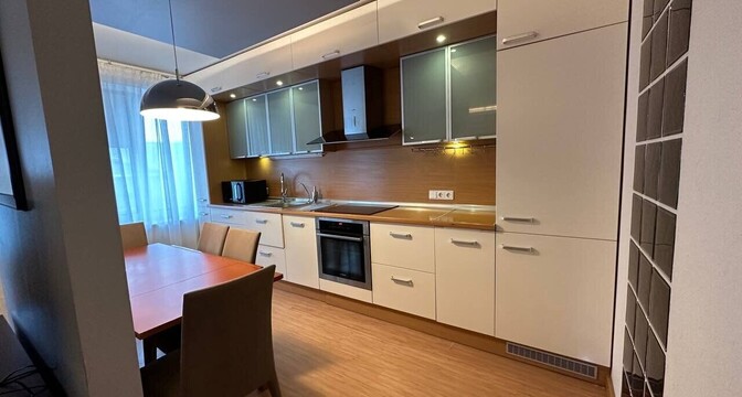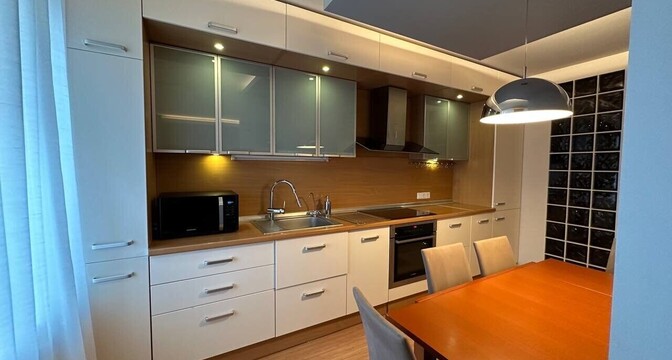Ремонт в квартире выполнен в классическом стиле, но выбраны нейтральные цвета, а стены выкрашены в белый цвет. В кухне на полу лежит плитка, а в столовой, как и в жилых комнатах, ламинат.