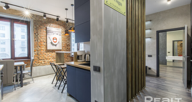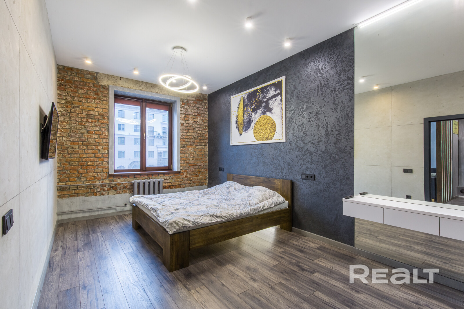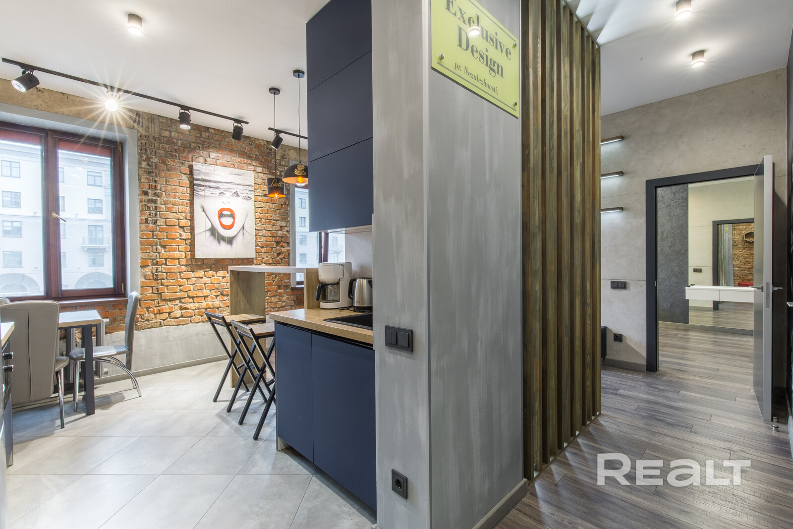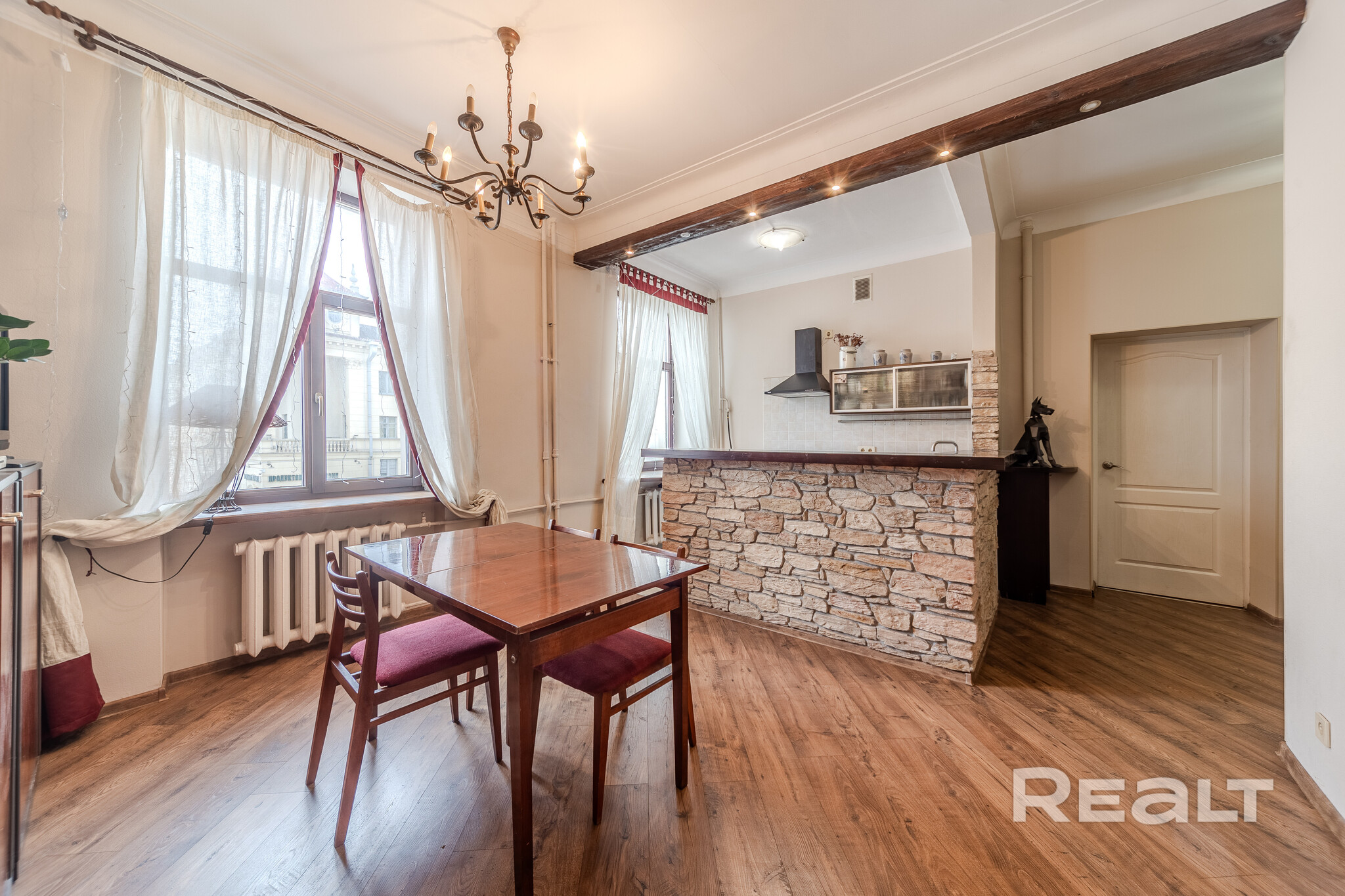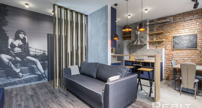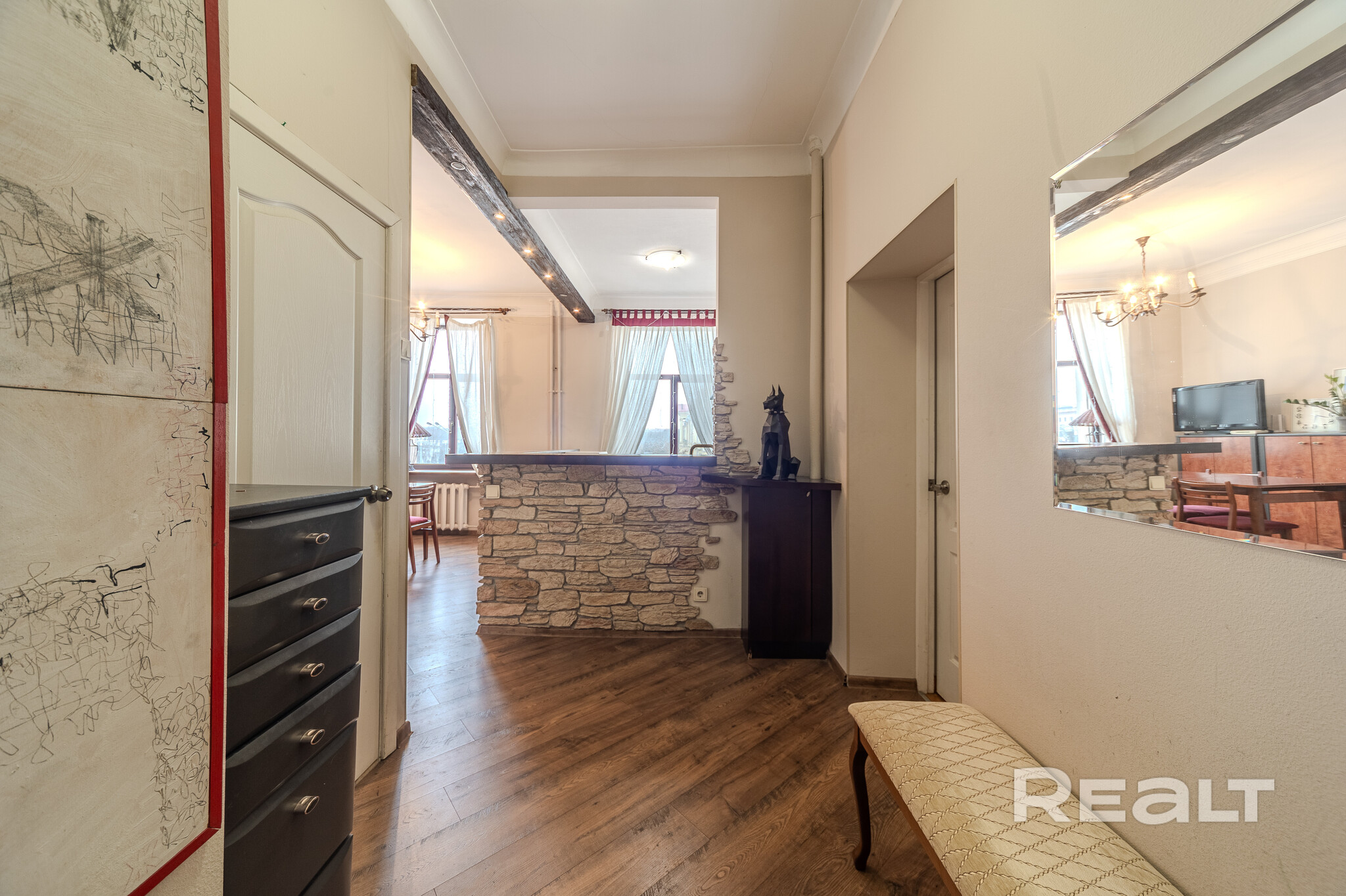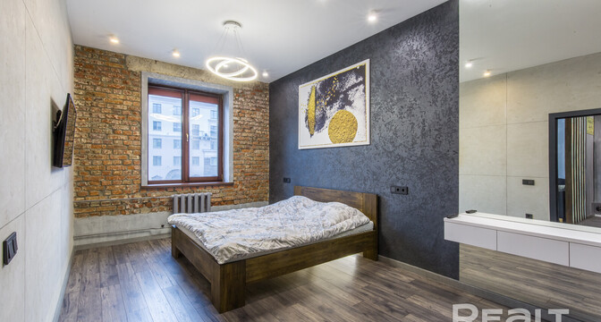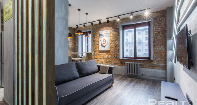 Еще один вариант около Площади Победы — двушка в лофт-стиле прямо у метро. Второй этаж шестиэтажной сталинки на проспекте Независимости, 37.