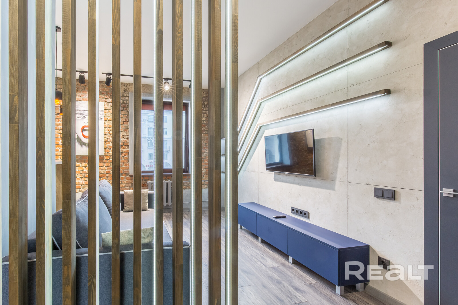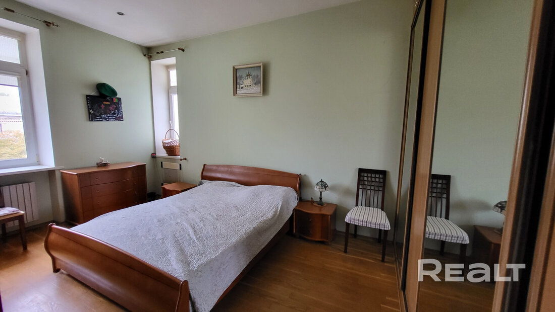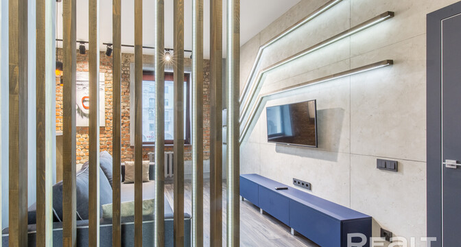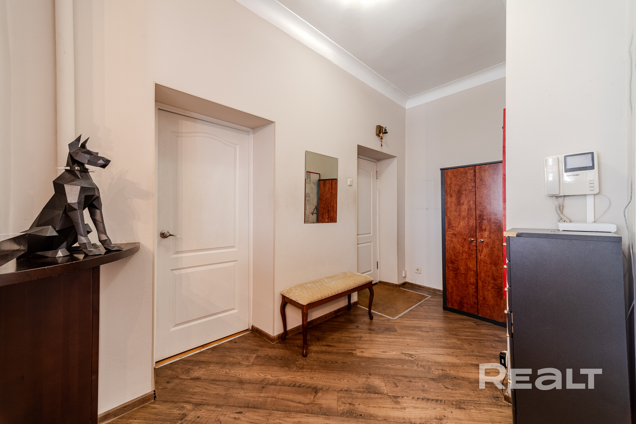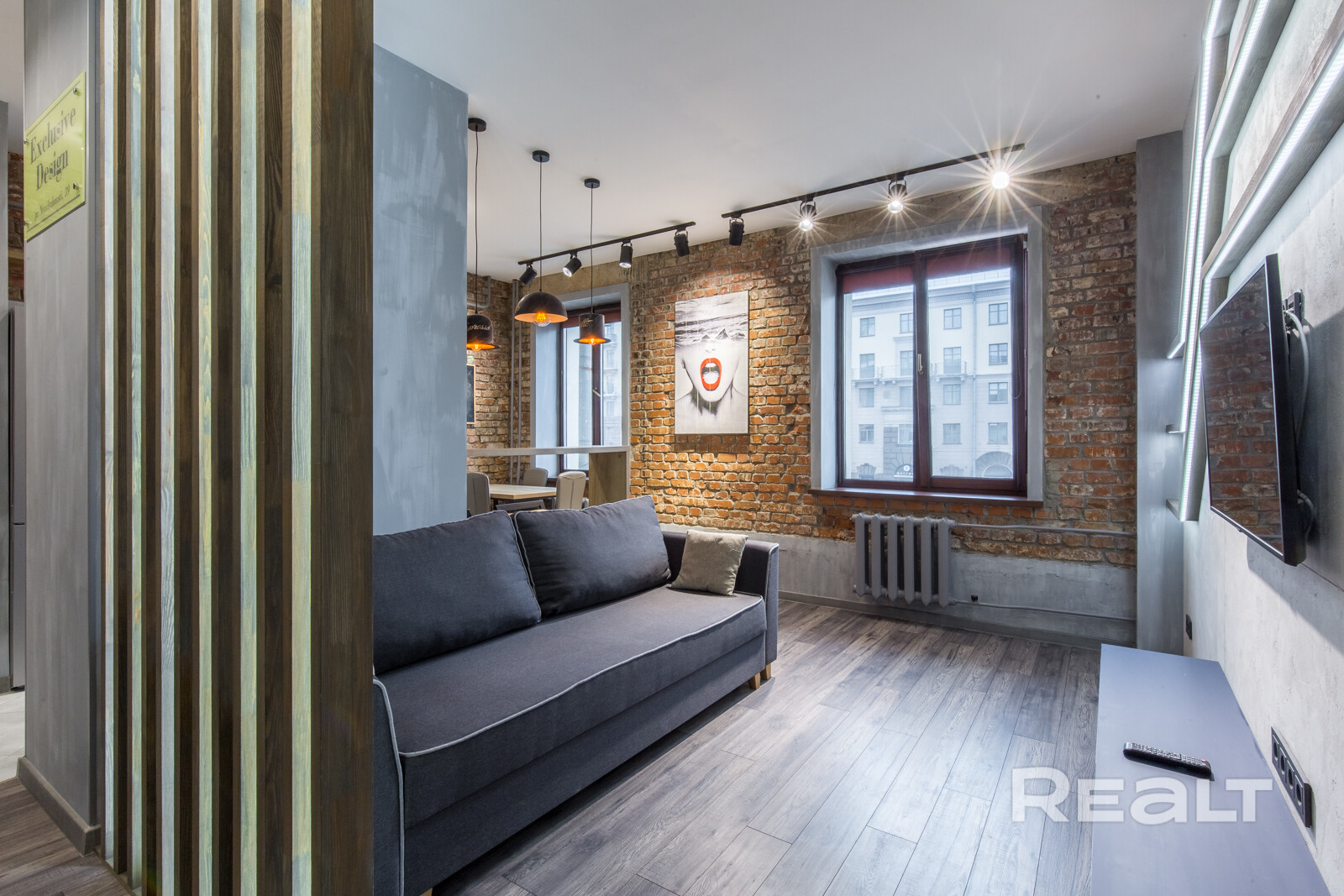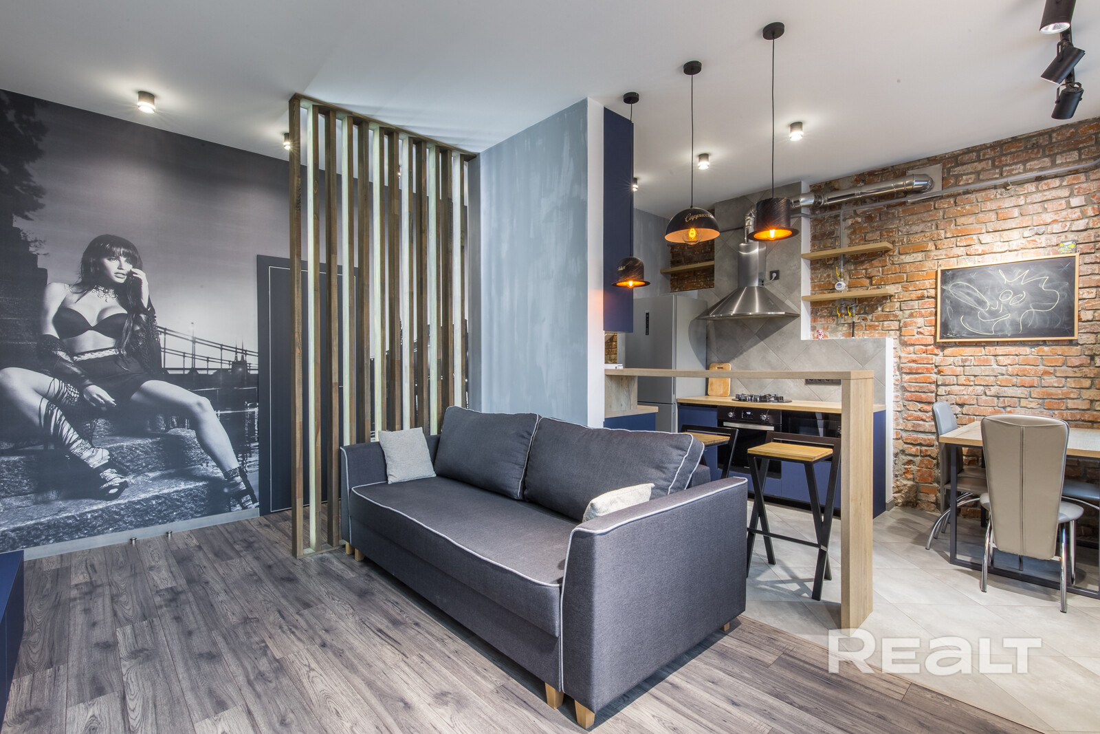 Еще один вариант около Площади Победы — двушка в лофт-стиле прямо у метро. Второй этаж шестиэтажной сталинки на проспекте Независимости, 37.