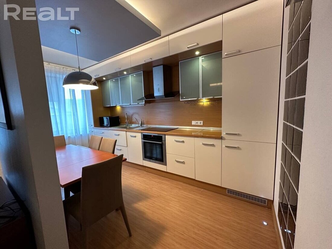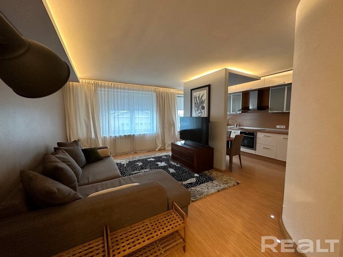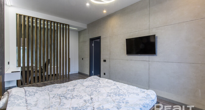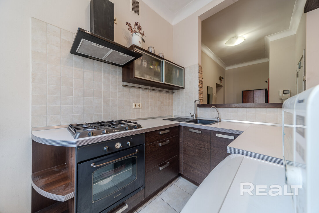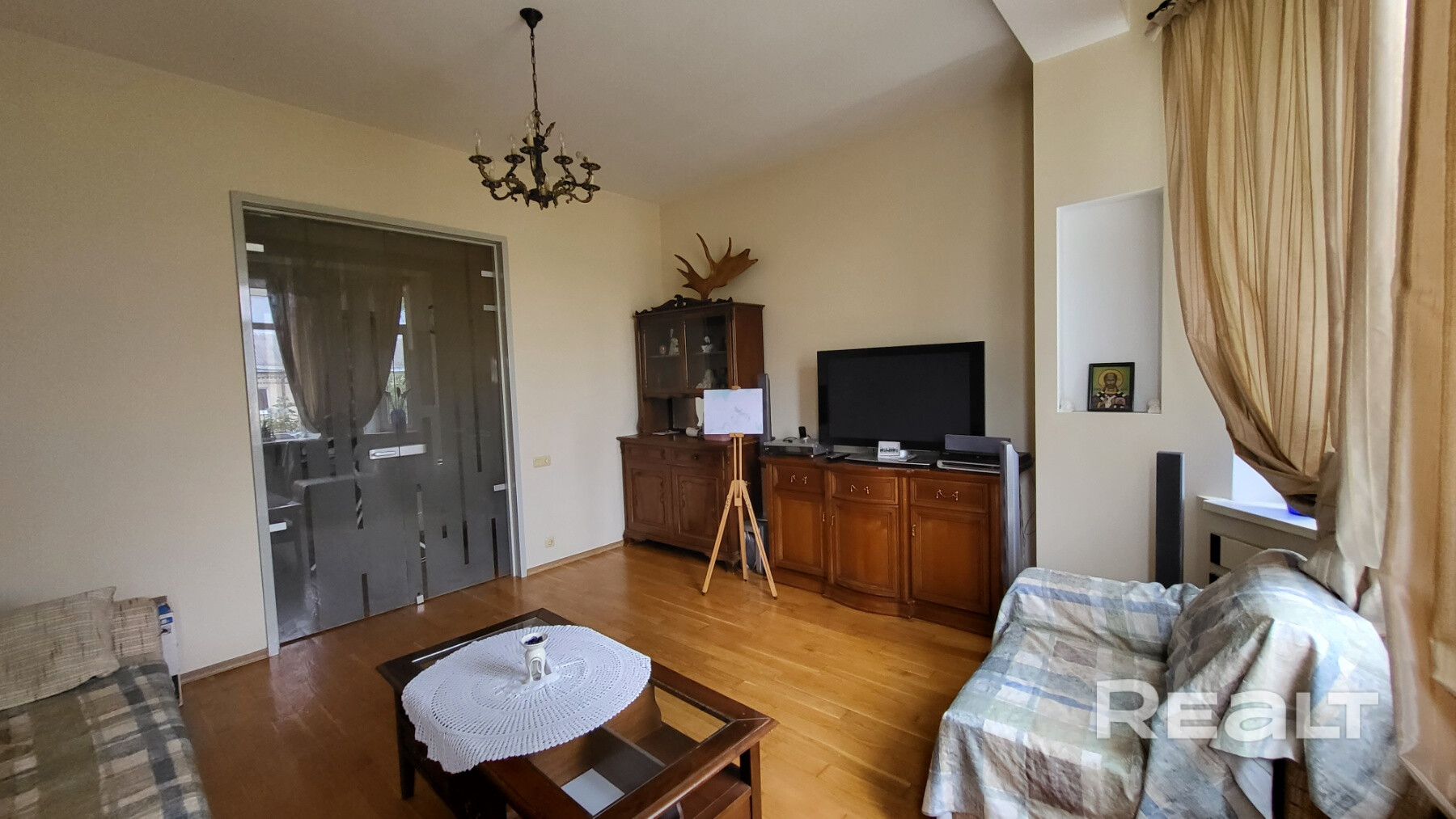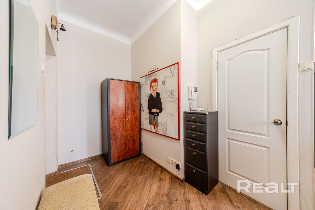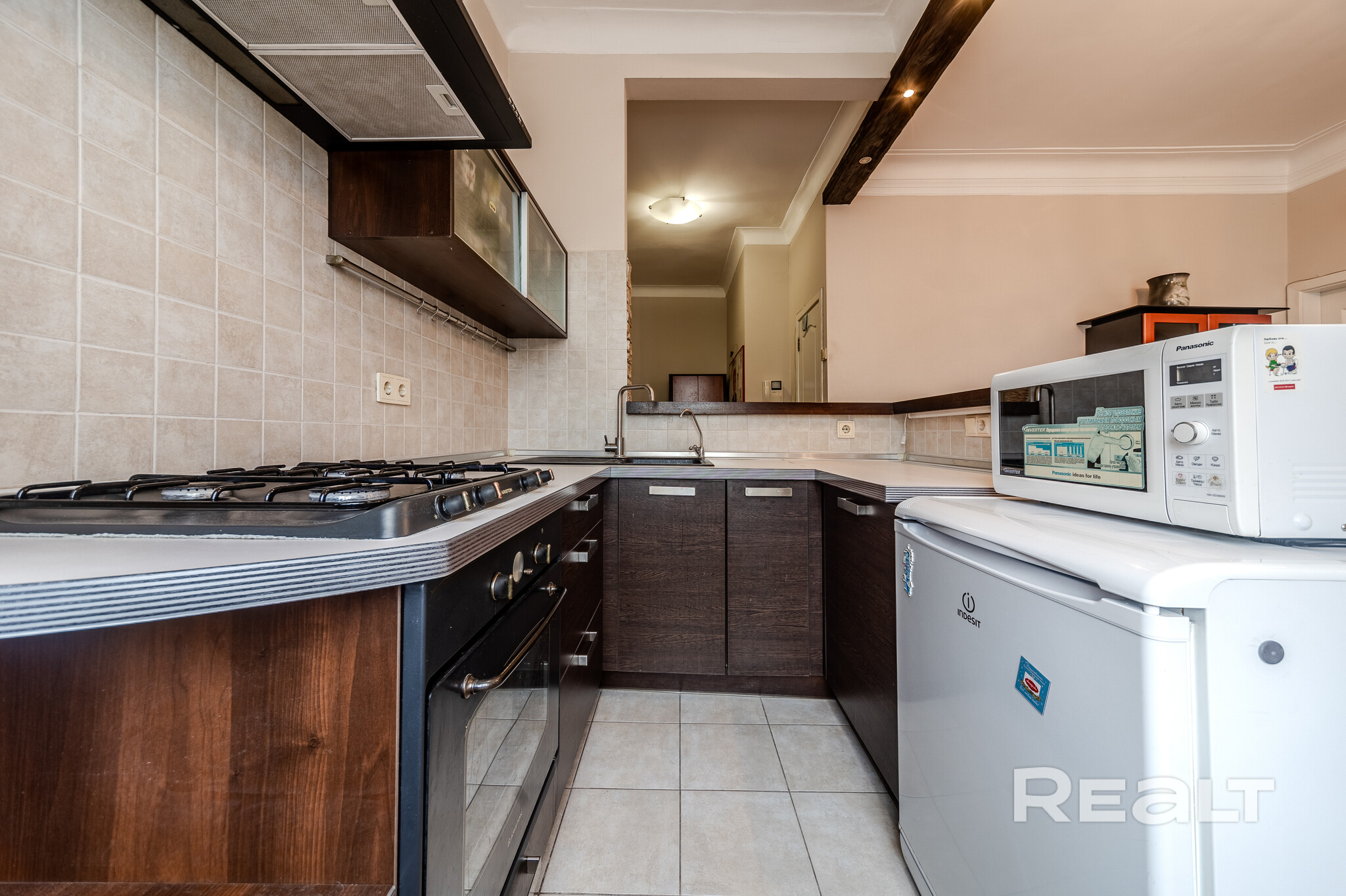 Еще один вариант около Площади Победы — двушка в лофт-стиле прямо у метро. Второй этаж шестиэтажной сталинки на проспекте Независимости, 37.