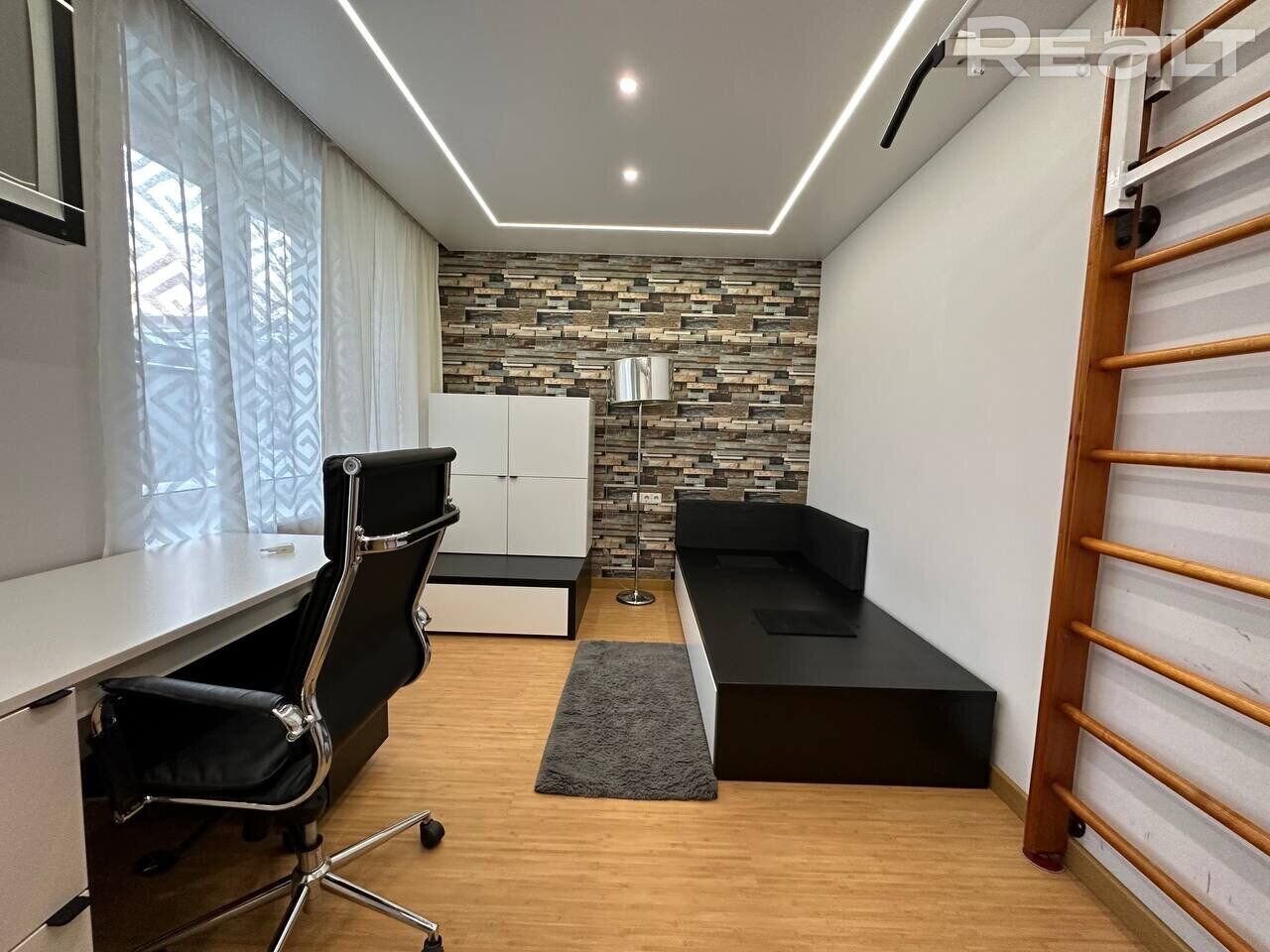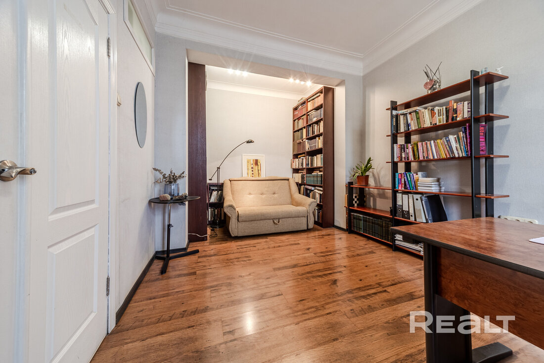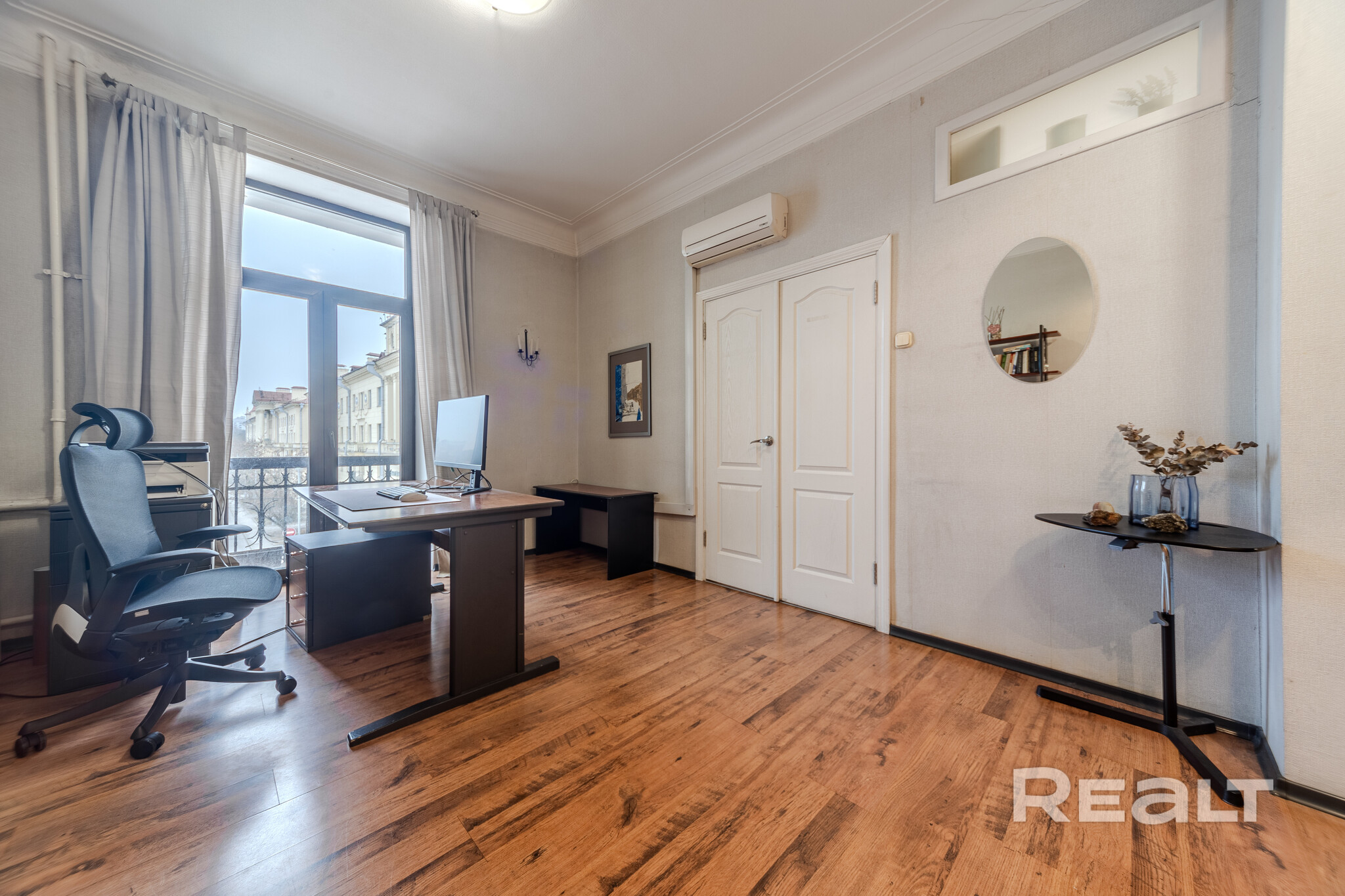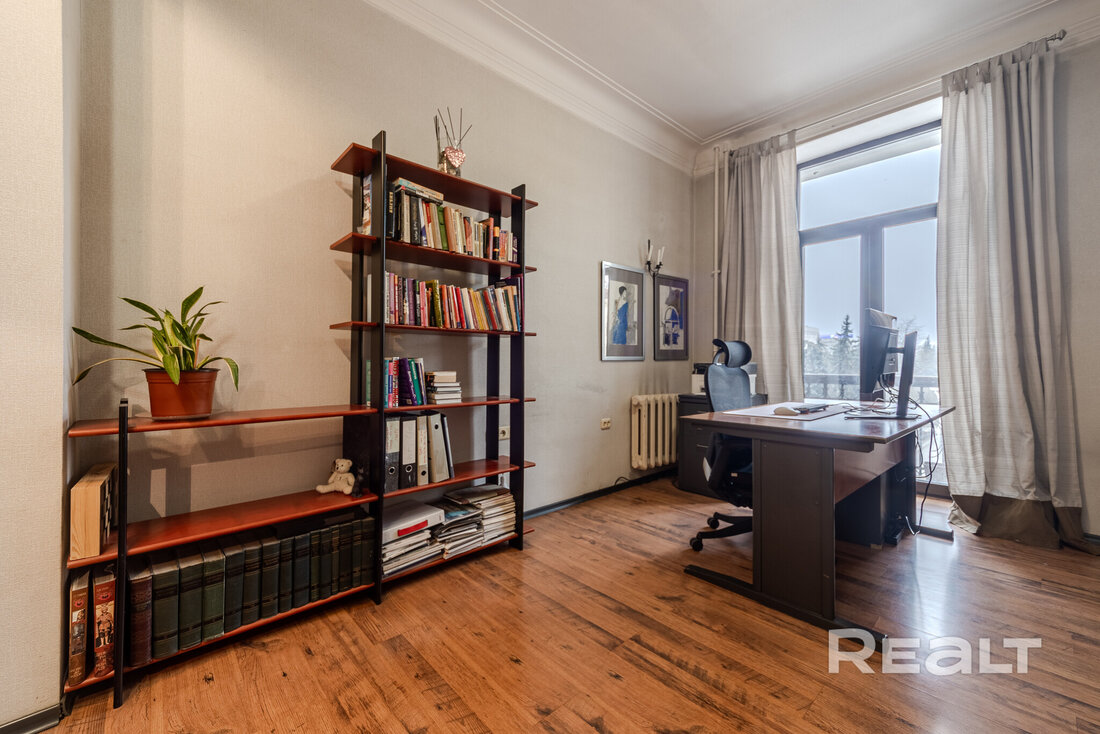 Особое внимание привлекает кабинет. Посмотрите, какое там французское окно с видом на Площадь Победы и широкие двери. Есть в кабинете и небольшой диван для отдыха.