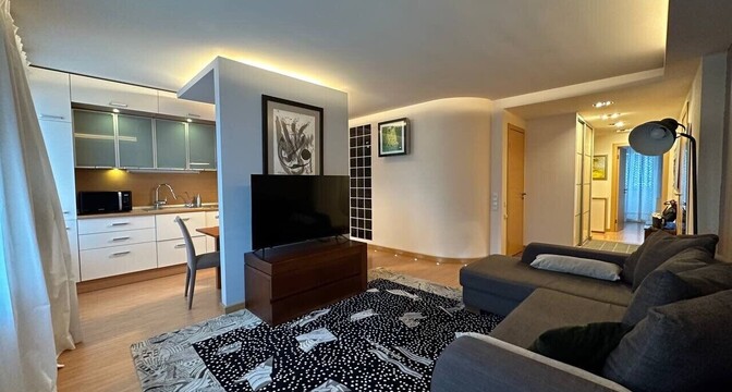 Общая площадь квартиры — 57 квадратов, 34 из них жилые, кухня — 8 метров. Квартира яркая, ремонт выполнен в стиле лофт. В спальне есть и рабочее место, огражденное от кровати перегородкой. Кухня и гостиная объединены. Санузел совмещенный.