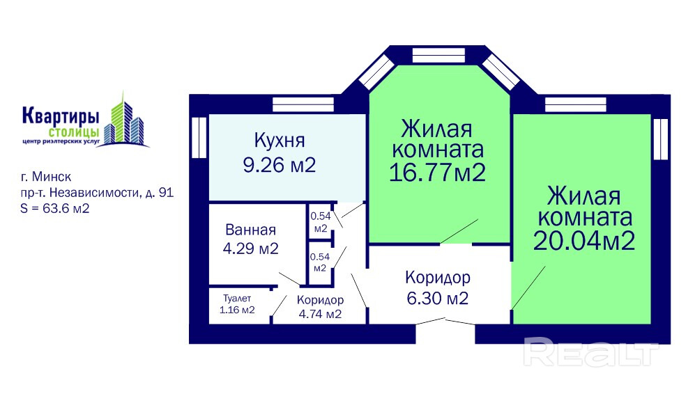 Квартира расположена на третьем этаже пятиэтажного дома. Хоть она и считается двухкомнатной, но фактически это целая евротрешка. Здесь есть кухня-столовая, которая по размеру не уступает любой кухне, совмещенной с гостиной; спальня и кабинет с большим окном и видом на Площадь Победы.