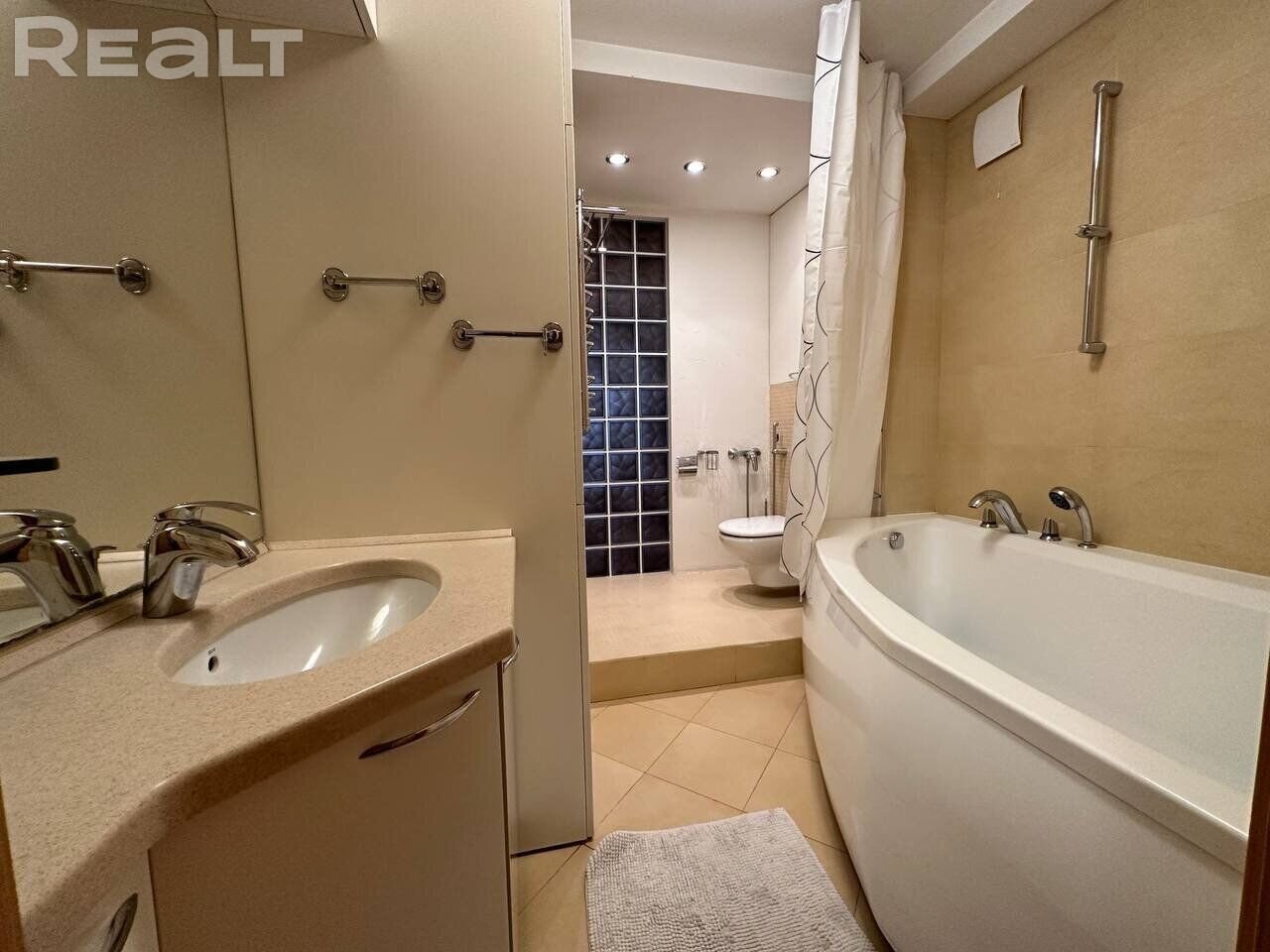 Санузел совмещенный. В просторной комнате получилось разместить, ванну, душевую и два умывальника. Есть и стиральная машина.