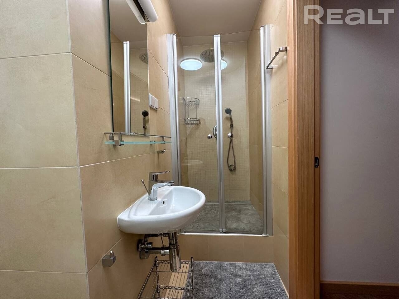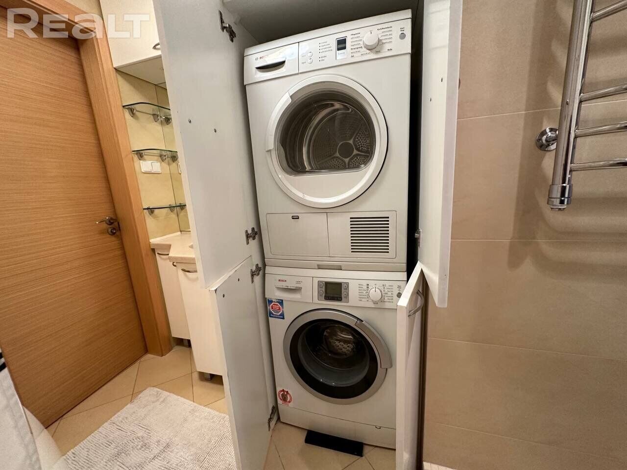 Санузел совмещенный. Есть и ванна, и душевая кабина. В шкафу спрятаны стиральная и сушильная машины.