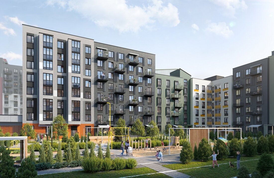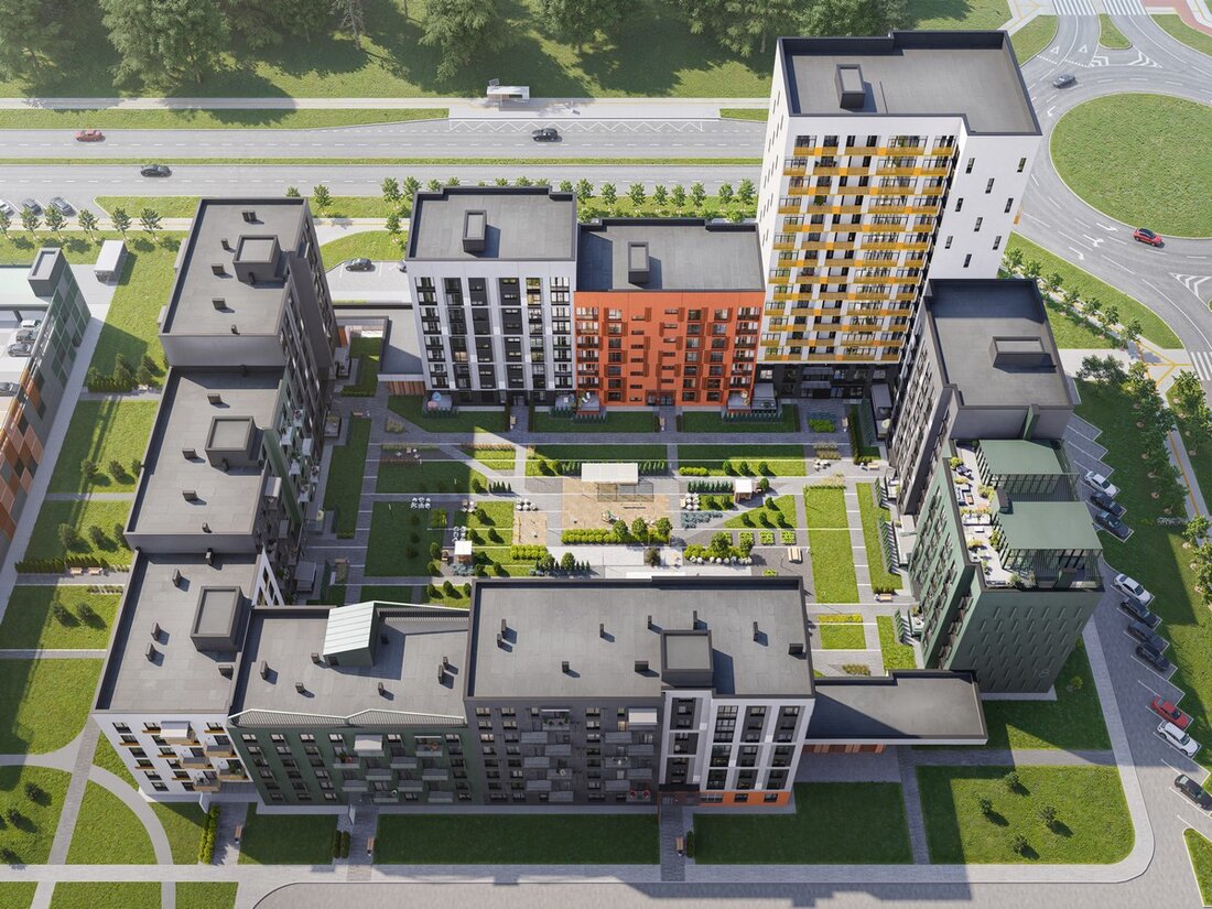 Двор дома спроектирован как уютное пространство с минималистичными арт-скульптурами животных, зонами отдыха и вечнозелеными насаждениями. Для детей продумана площадка с оборудованием для малышей, а для велосипедистов — велобоксы на 40% квартир.