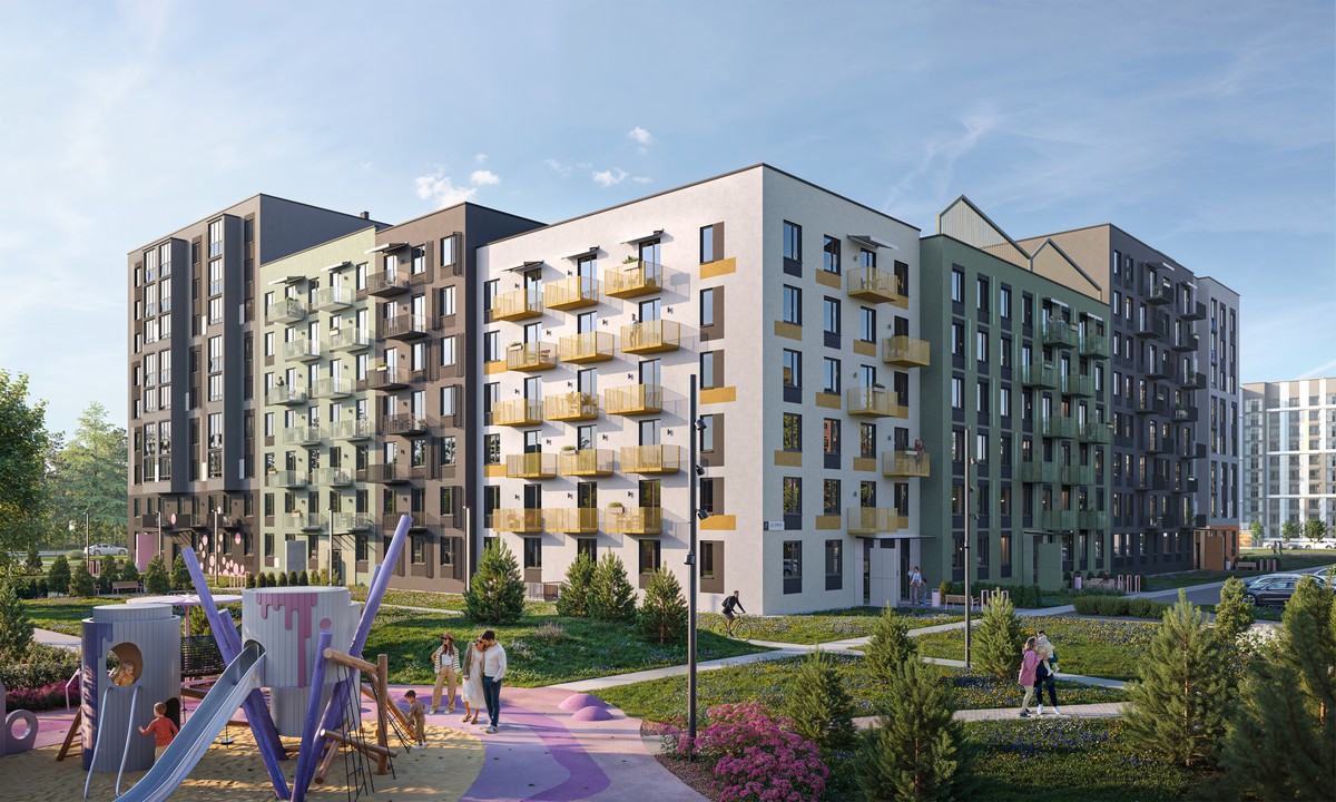Новый дом группы углом выходит на пешеходный АРТ-бульвар и детскую площадку, а одним торцом — на лес. Секции со стороны пешеходного бульвара имеют пониженную этажность — всего 6 этажей. Архитектурные решения подчеркивают лаконичность и геометричность: монохромная палитра, остекленные лоджии и открытые балконы с электромеханическими маркизами на верхних этажах.