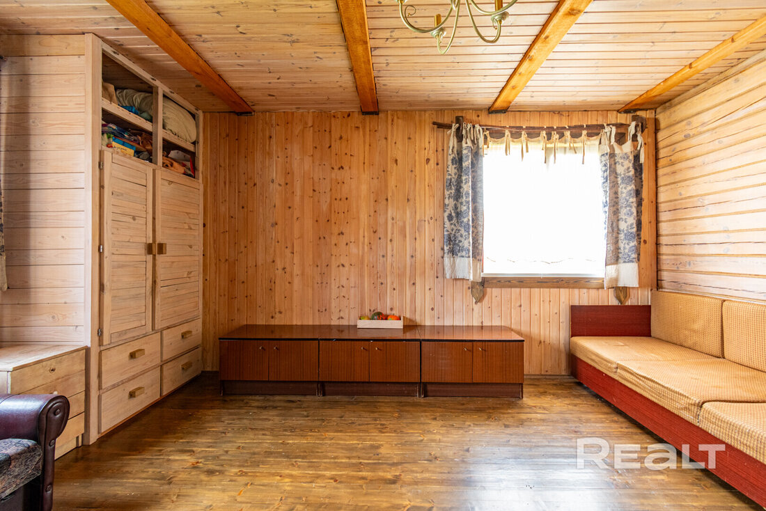 Этот экологичный дом был построен в 2013 году из соснового лафета и утеплен эковатой. Он стоит на бутобетонном фундаменте, перекрытия — деревянные, крыша покрыта гибкой черепицей, окна оборудованы пластиковыми стеклопакетами.