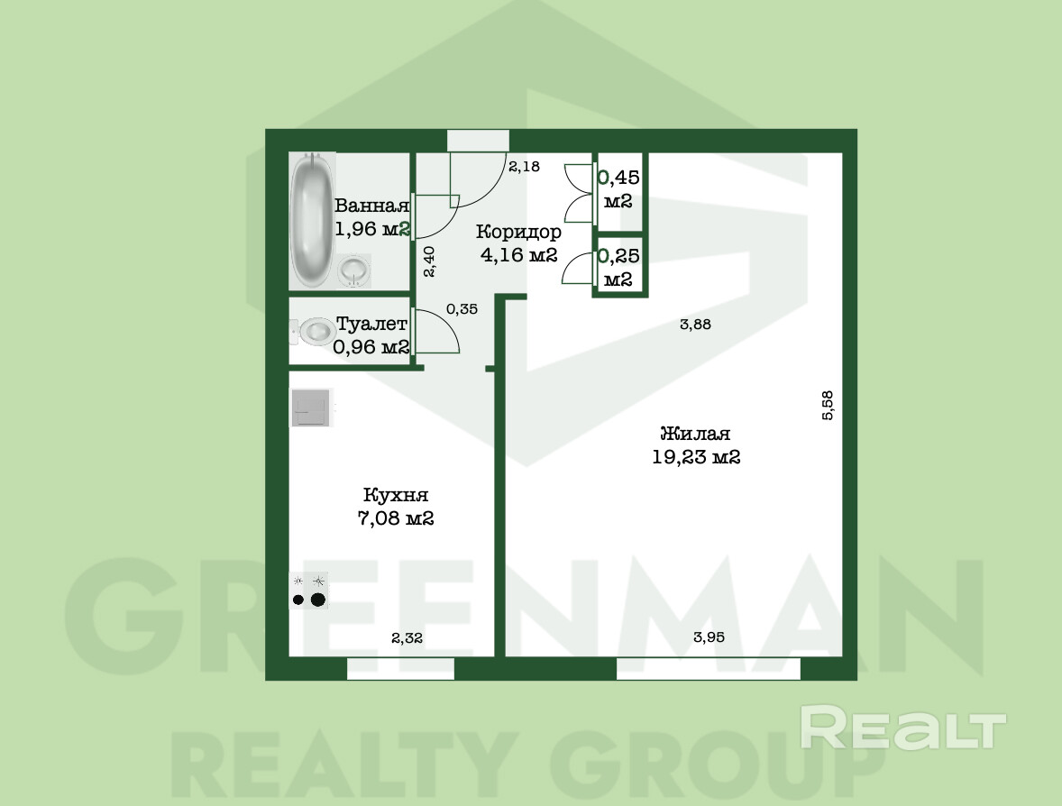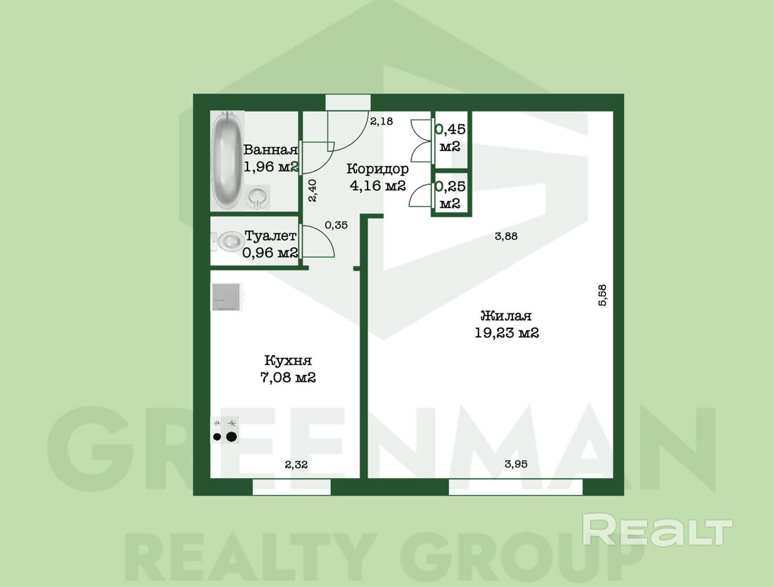 Общая площадь однушки — 34 квадрата, а жилая — 19 квадратов. Главное, пожалуй, планировочное отличие от квартир Минск Мира — отдельная кухня. Ее площадь составляет 7 квадратов.
