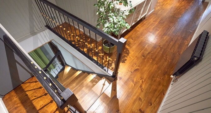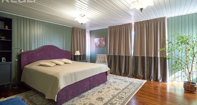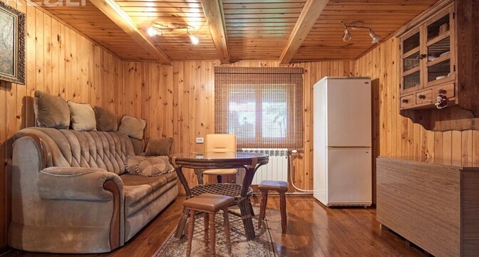 В интерьере превалирует отделка деревом, много кованных элементов. Имеется вся необходимая мебель и бытовая техника.