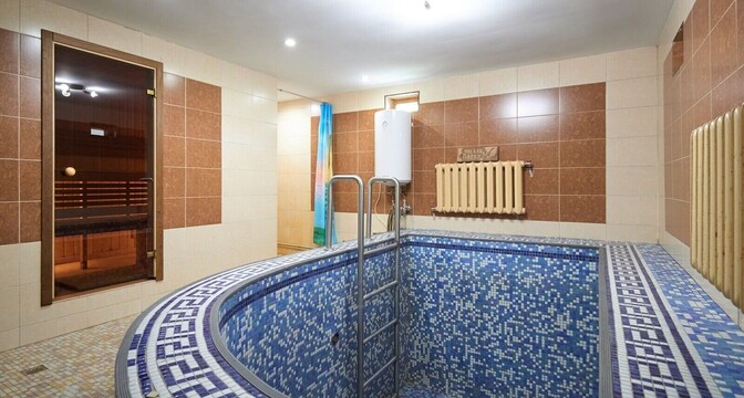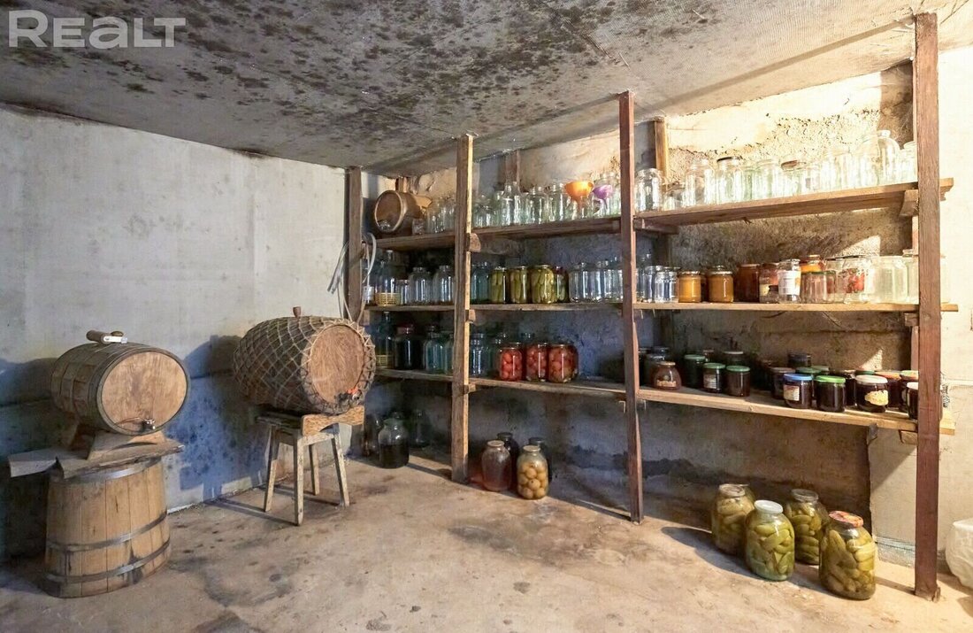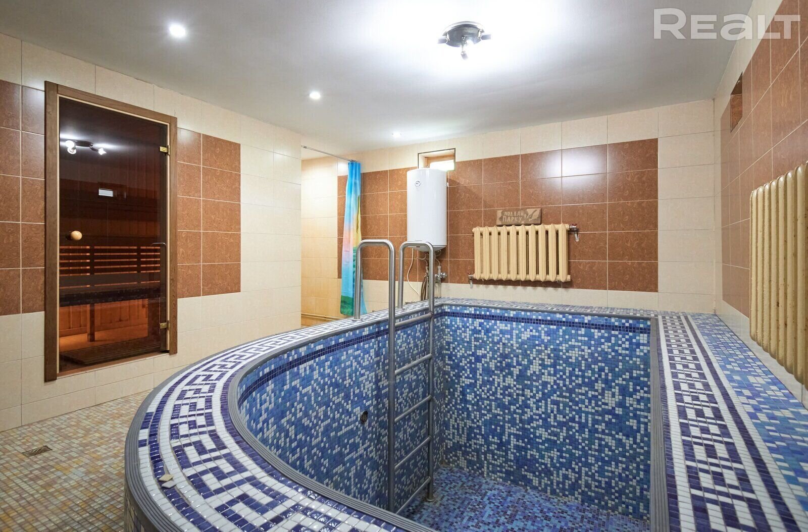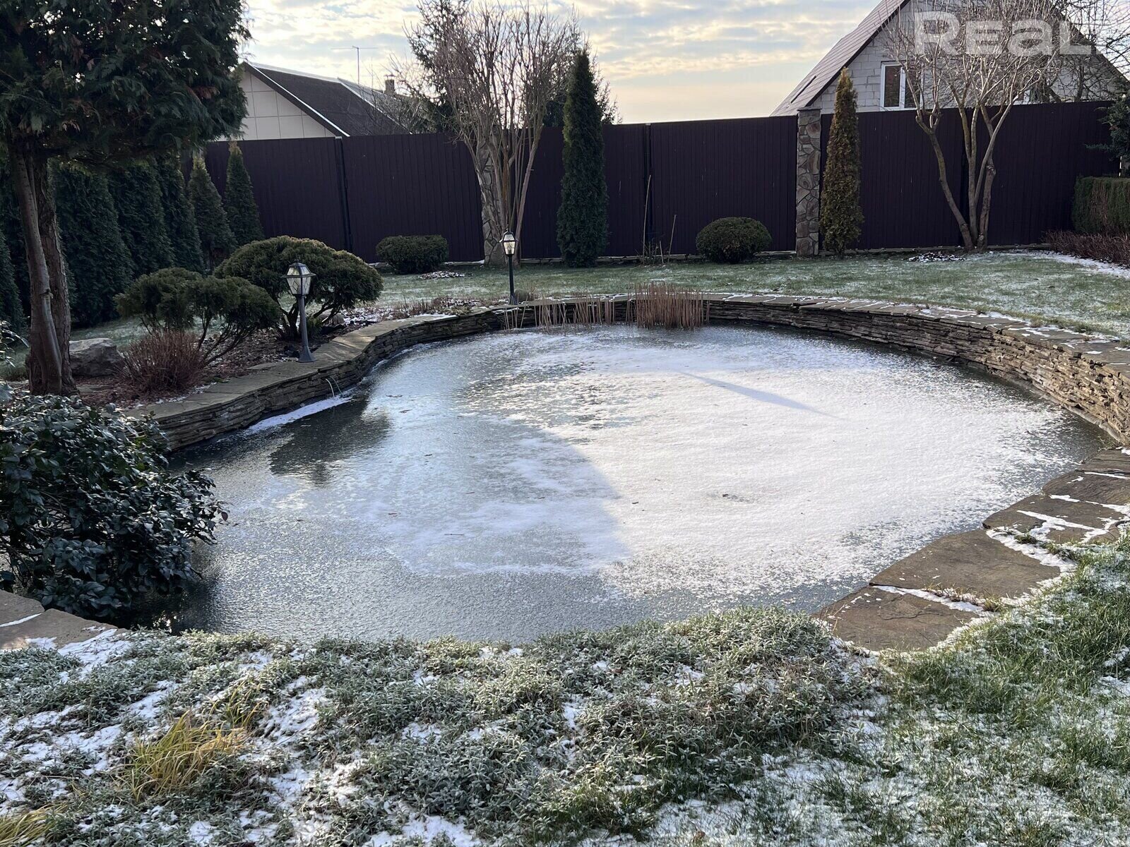 Участок большой — 25 соток. На нем расположены отдельные постройки: баня с купелью и гостевой комнатой, хозблок для хранения инвентаря с большим погребом и гостевой комнатой, сарай, летняя кухня с печкой, виноградная беседка, вольер для собаки, пруд с рыбками.