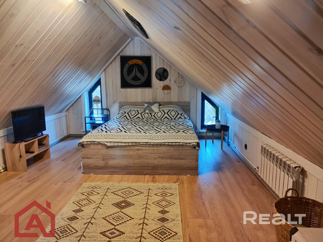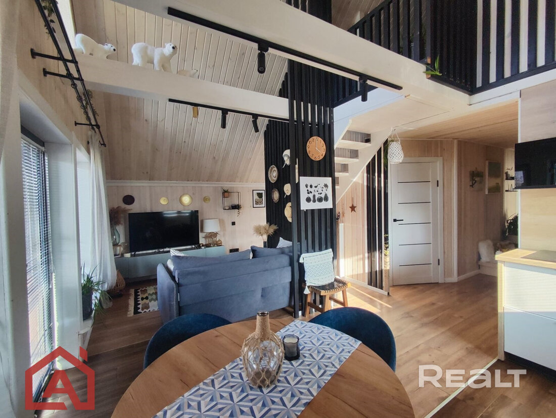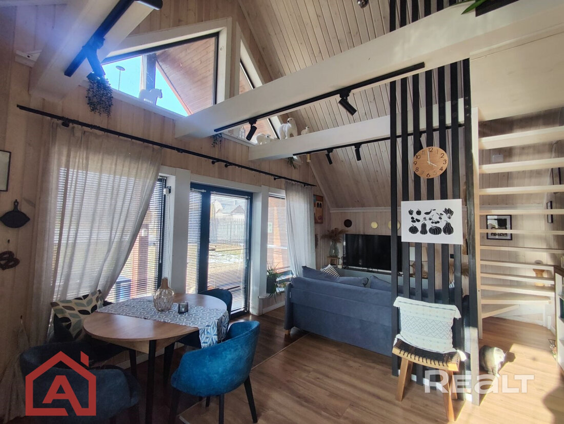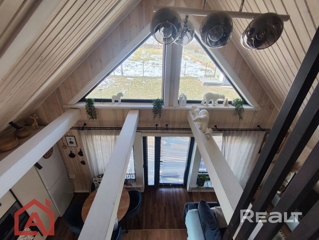 Внизу находится кухня-гостиная, санузел и одна спальная комната, а наверху в мансарде устроено еще одно жилое помещение.