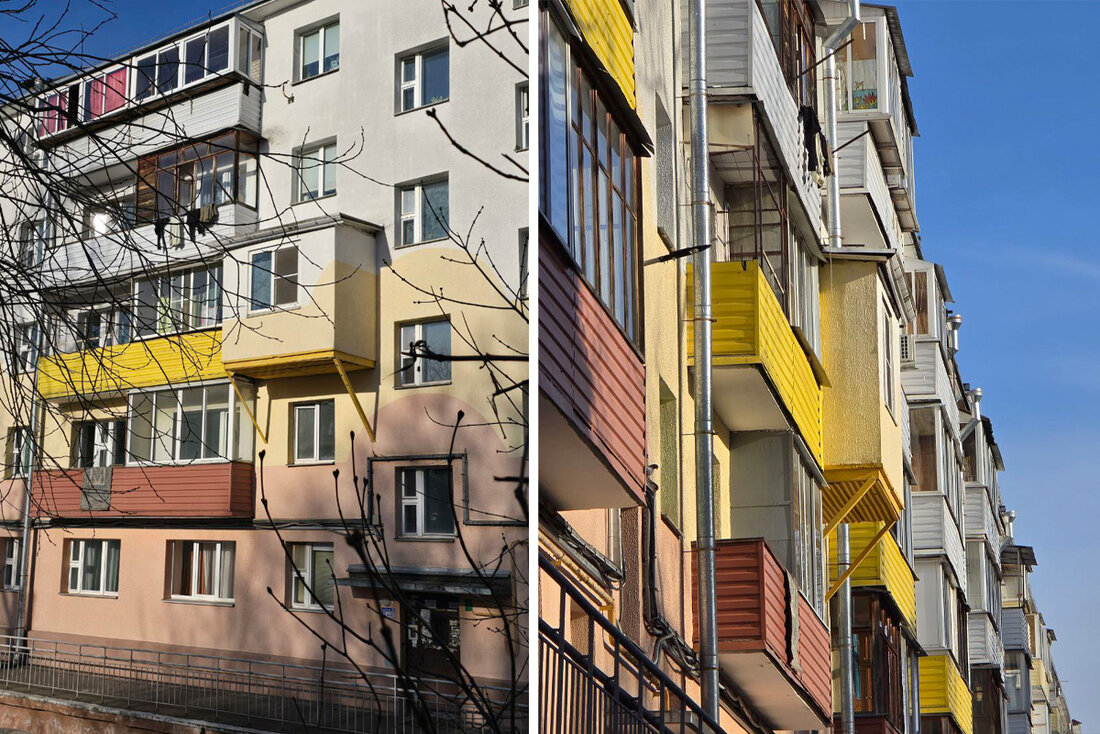 Балкон выделяется опорной конструкцией выносной площадки. Его немного вписали в общую стилистику фасада, судя по всему, во время капремонта, покрасив в те же цвета, что и весь дом.
