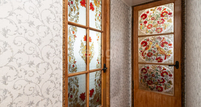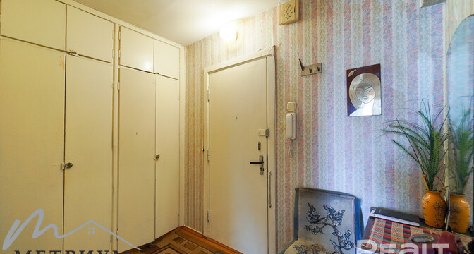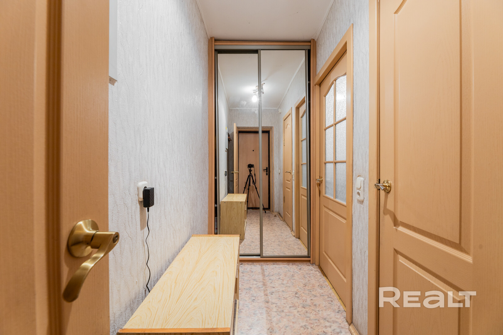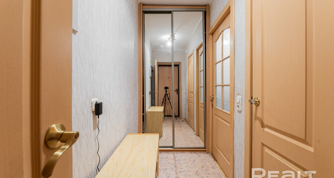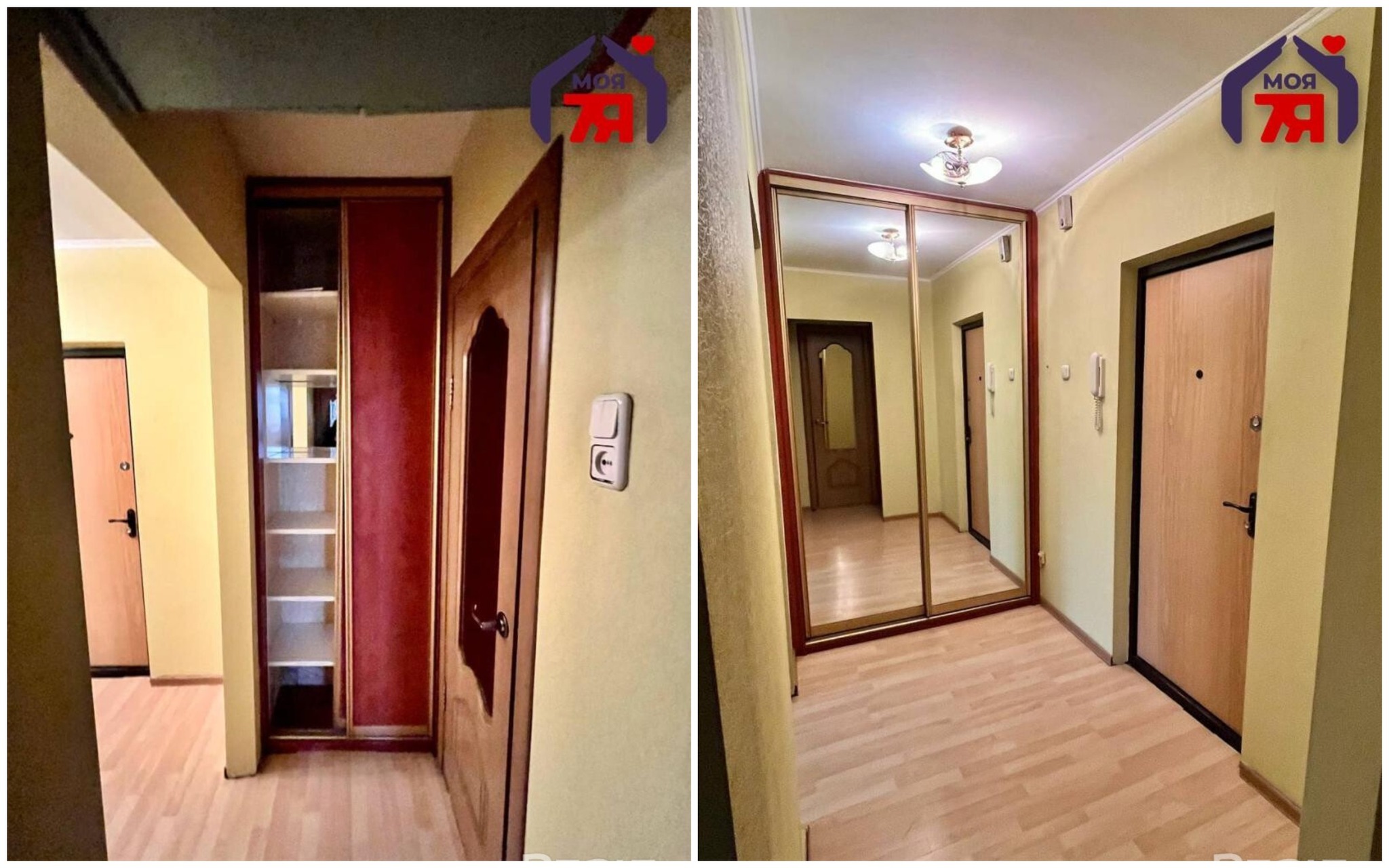 Квартира нуждается в обновлении. На полу в комнате уложена доска, в коридоре — ламинат, в санузлах — плитка. В прихожей есть шкафы-купе.