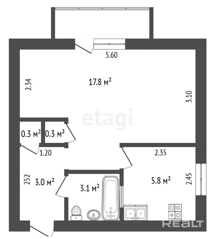 Санузел тут совмещенный. Из комнаты есть выход на застекленный балкон.