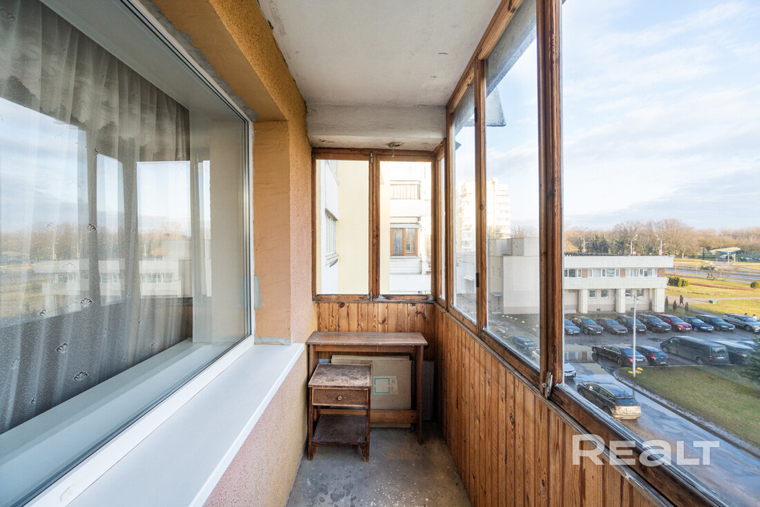 Кухня располагается между двумя жилыми комнатами. Самая большая имеет выход на застекленный балкон. В окнах стоят стеклопакеты ПВХ. Все они выходят на стелу.