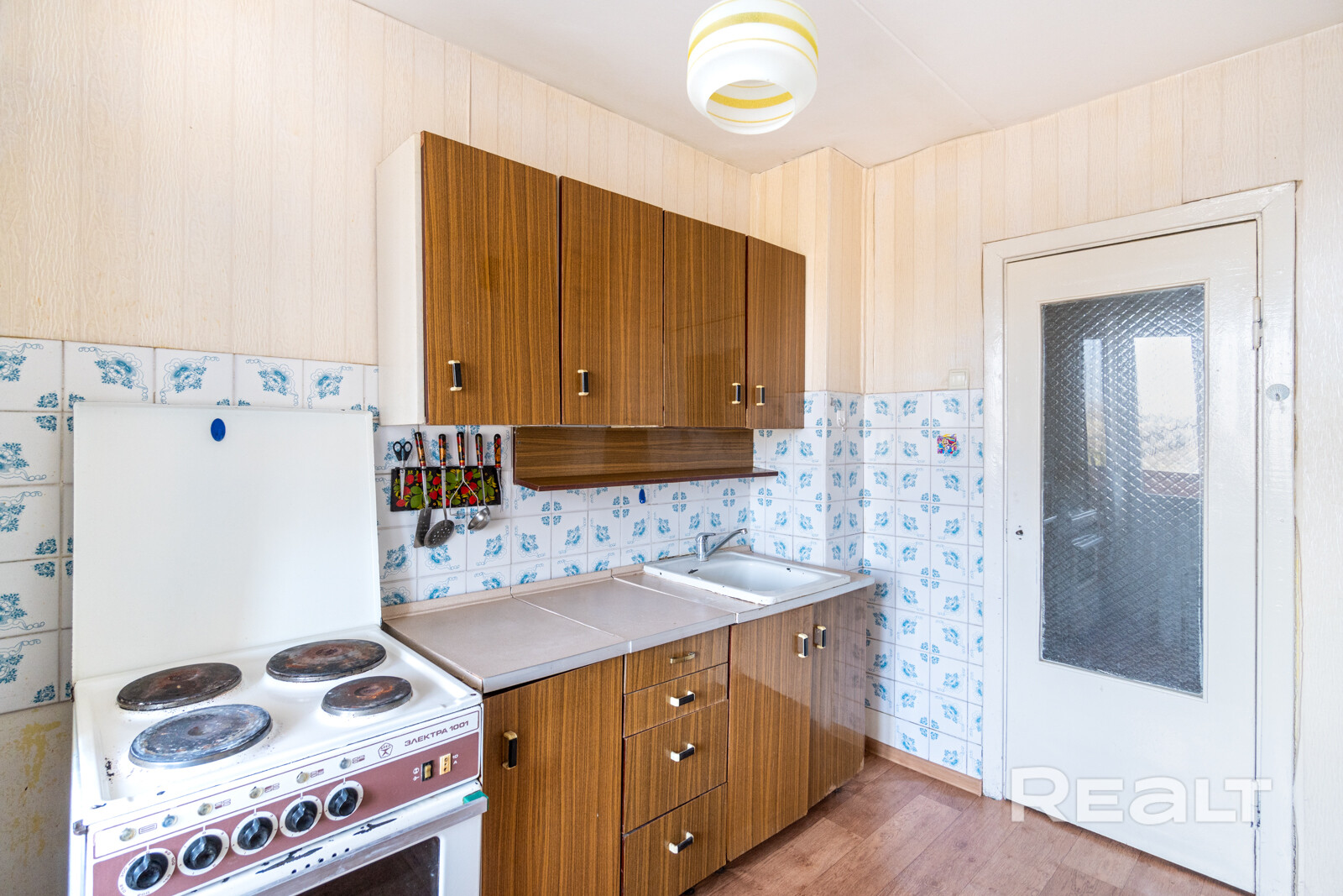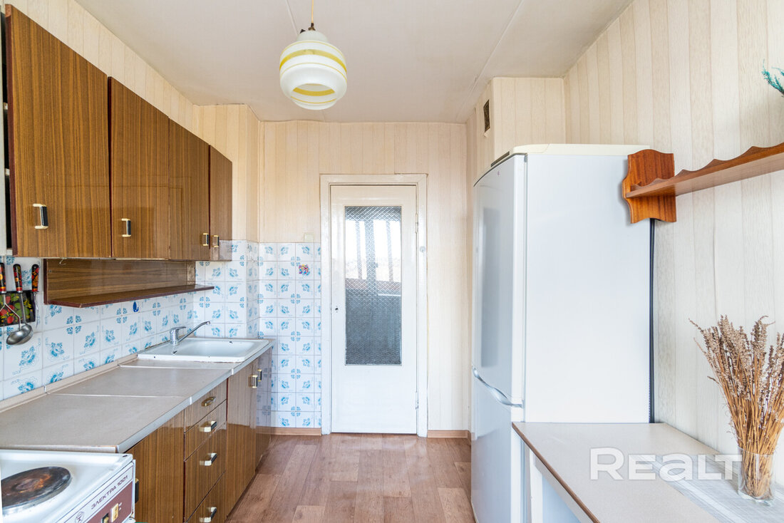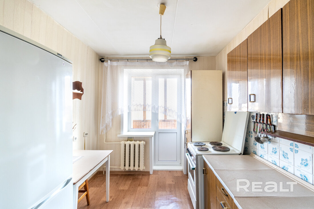 Кухня занимает 7,7 м². В квартире сохранился советский интерьер. В этой зоне висит старый гарнитур, стоит электрическая плита, а часть стены и фартук отделаны плиткой, которая сейчас считается винтажной.