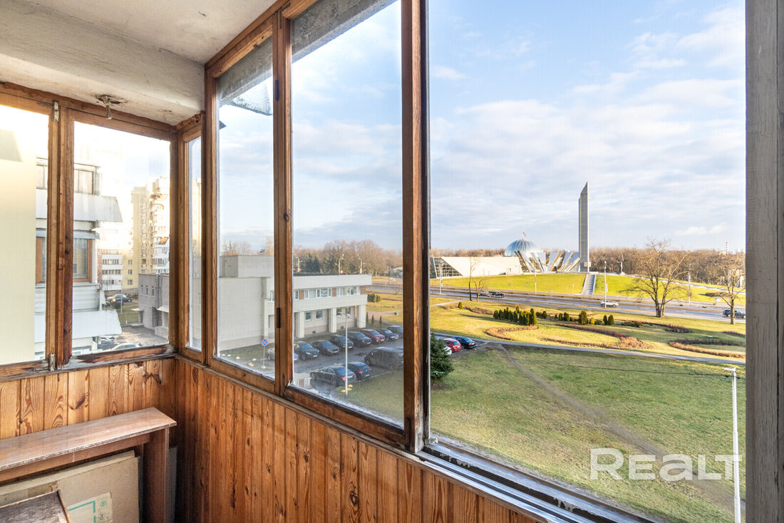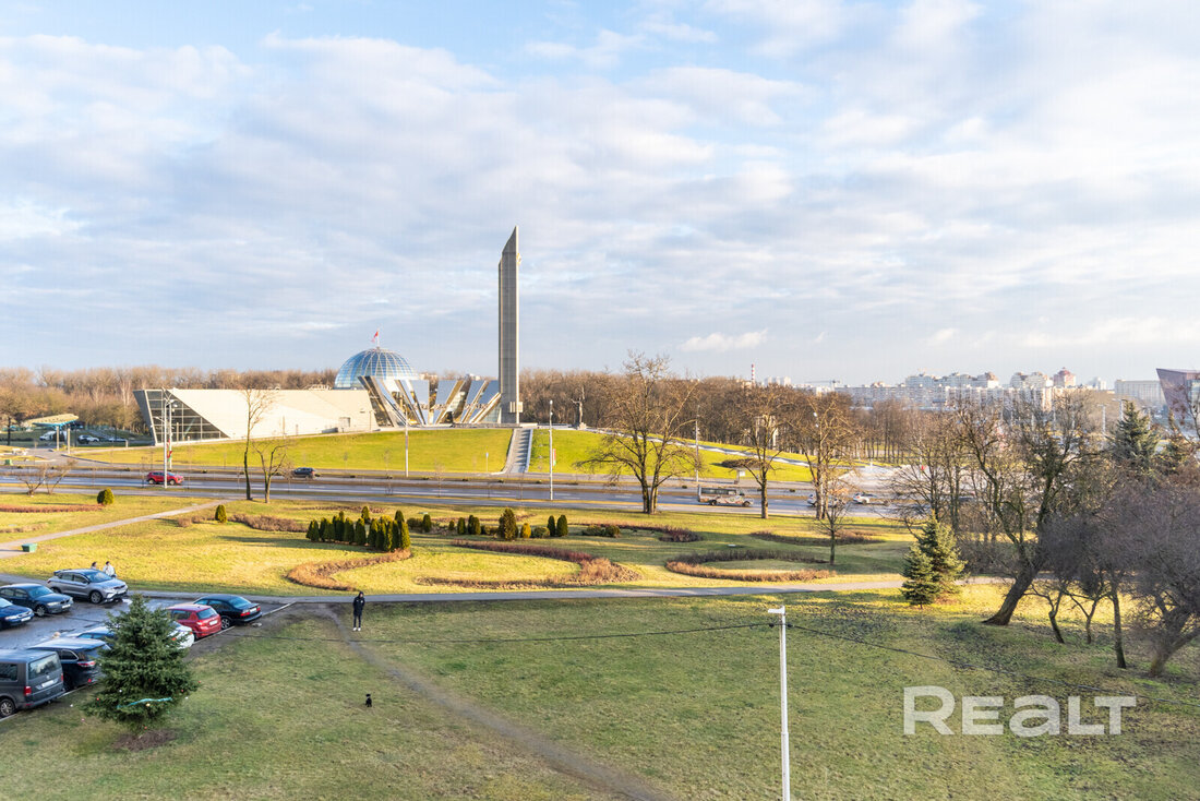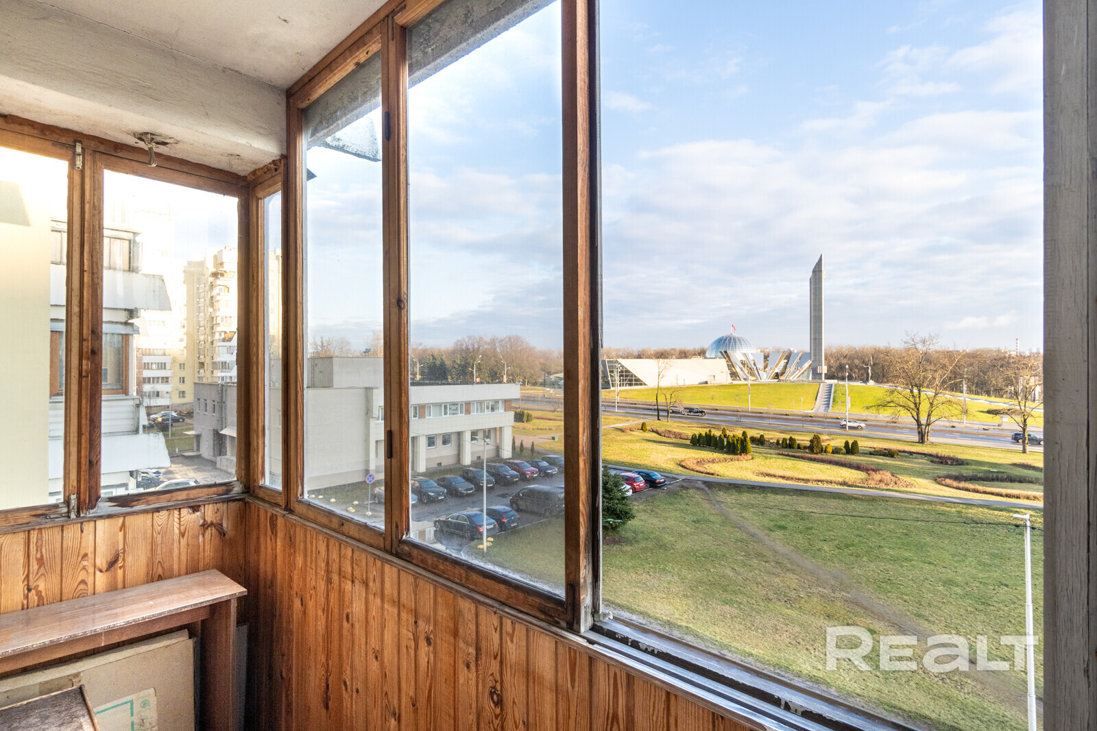В 80-е напротив стелы появились дома в стиле модернизма второй волны. Возводили их из кирпича и со встроено-пристроенными помещениями для торговли и услуг. В одном таком кирпичном доме продается квартира с советским интерьером и видом на стелу. Показываем, как она выглядит и сколько стоит.