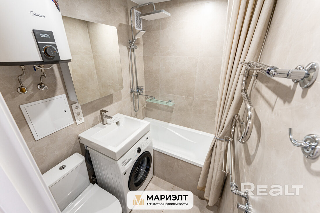 Совмещенный санузел облицован плиткой. Здесь стоит стиральная машина, висит бойлер. Из комнаты есть выход на открытый балкон.