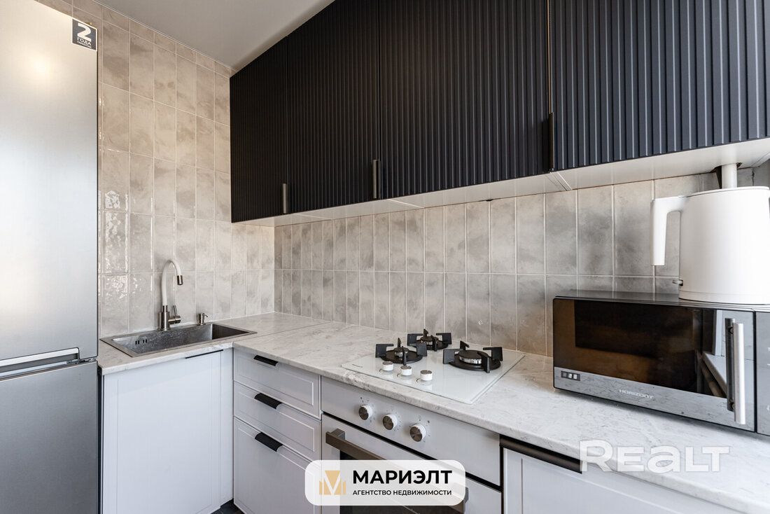 В квартире сделан новый ремонт. В кухне установлен гарнитур из МДФ. Здесь уже есть духовой шкаф, газовая варочная поверхность Weissgauff, холодильник Beko.